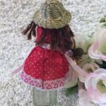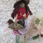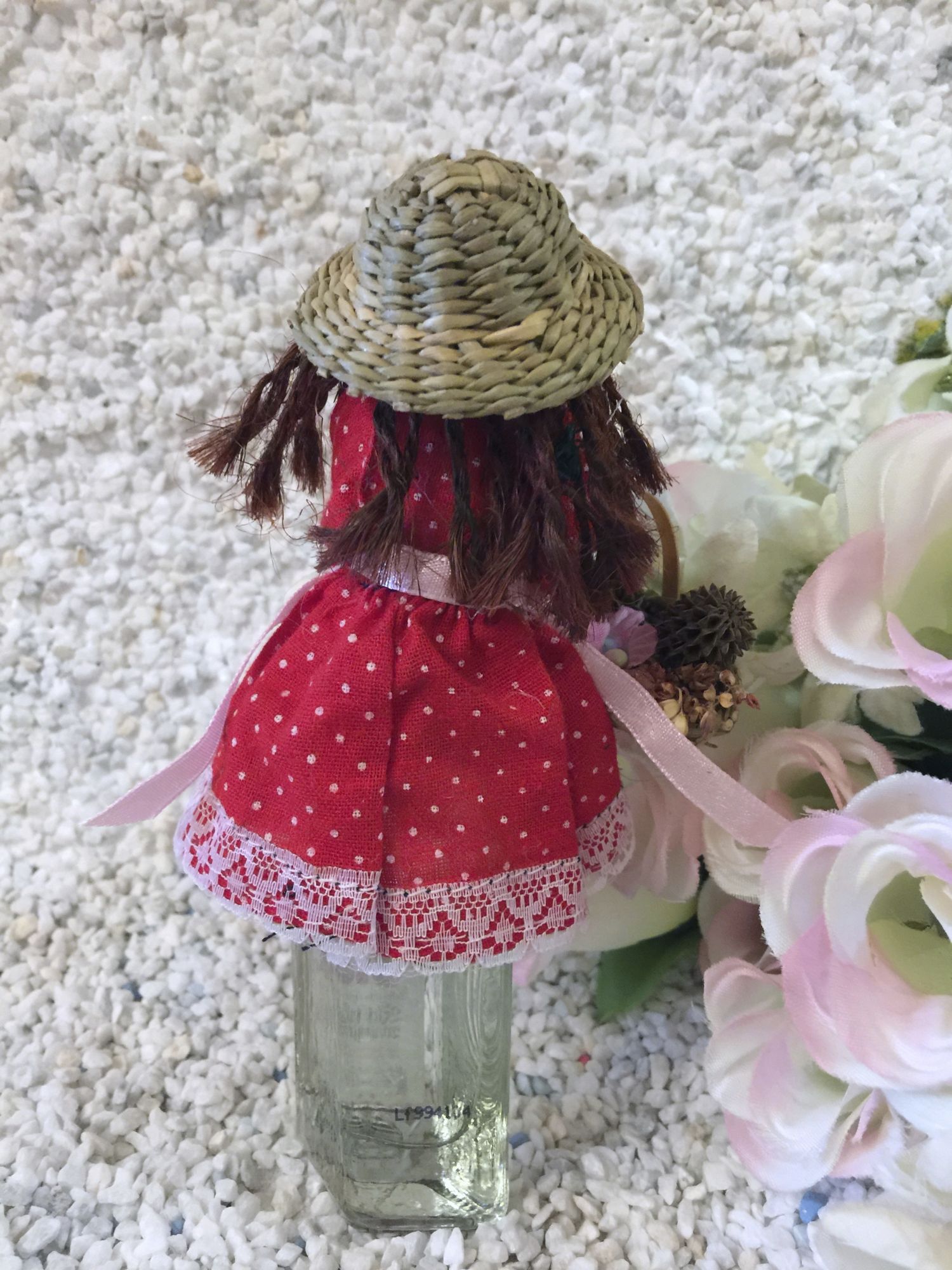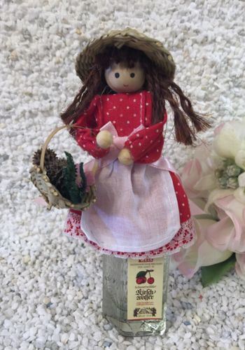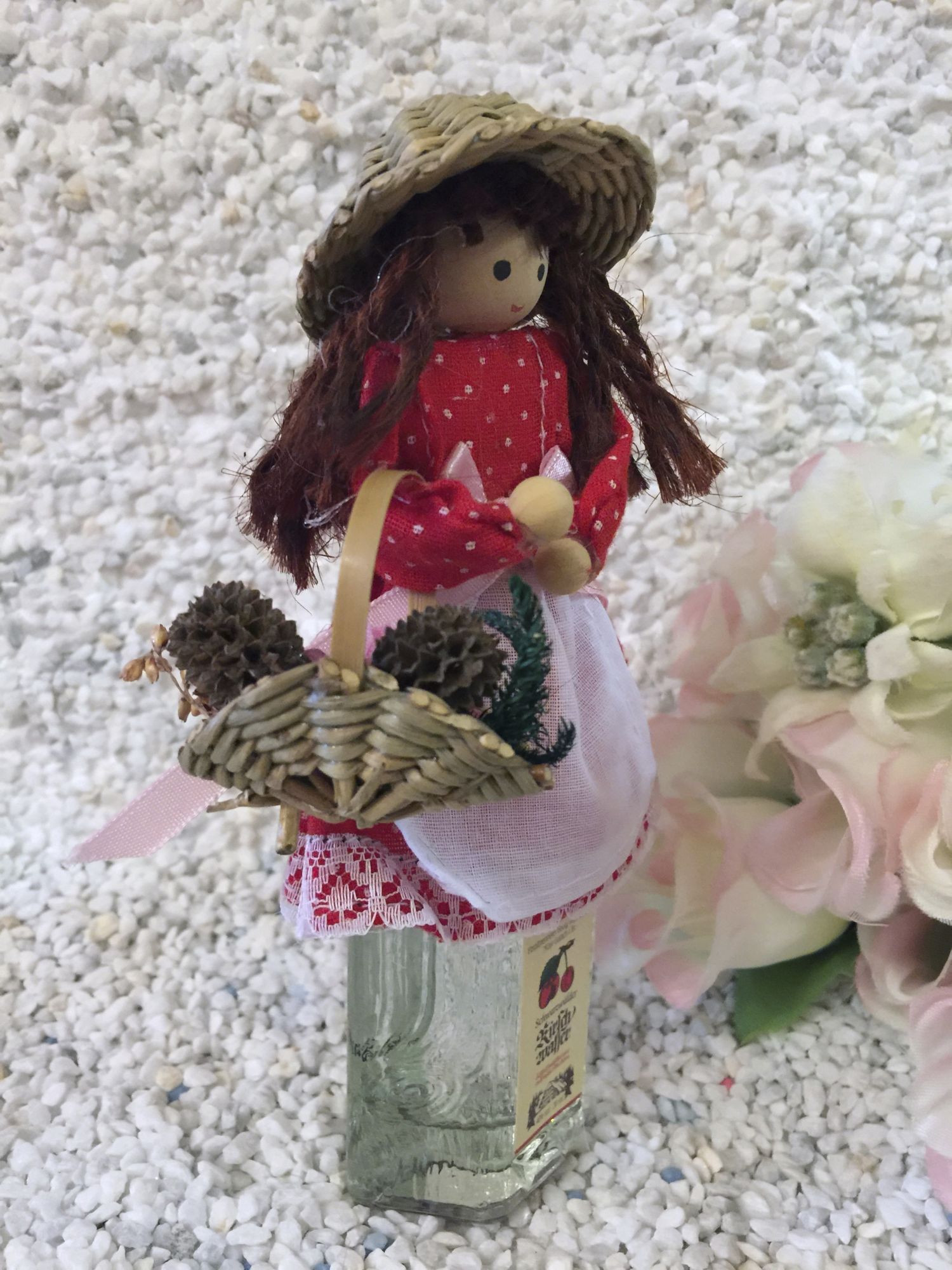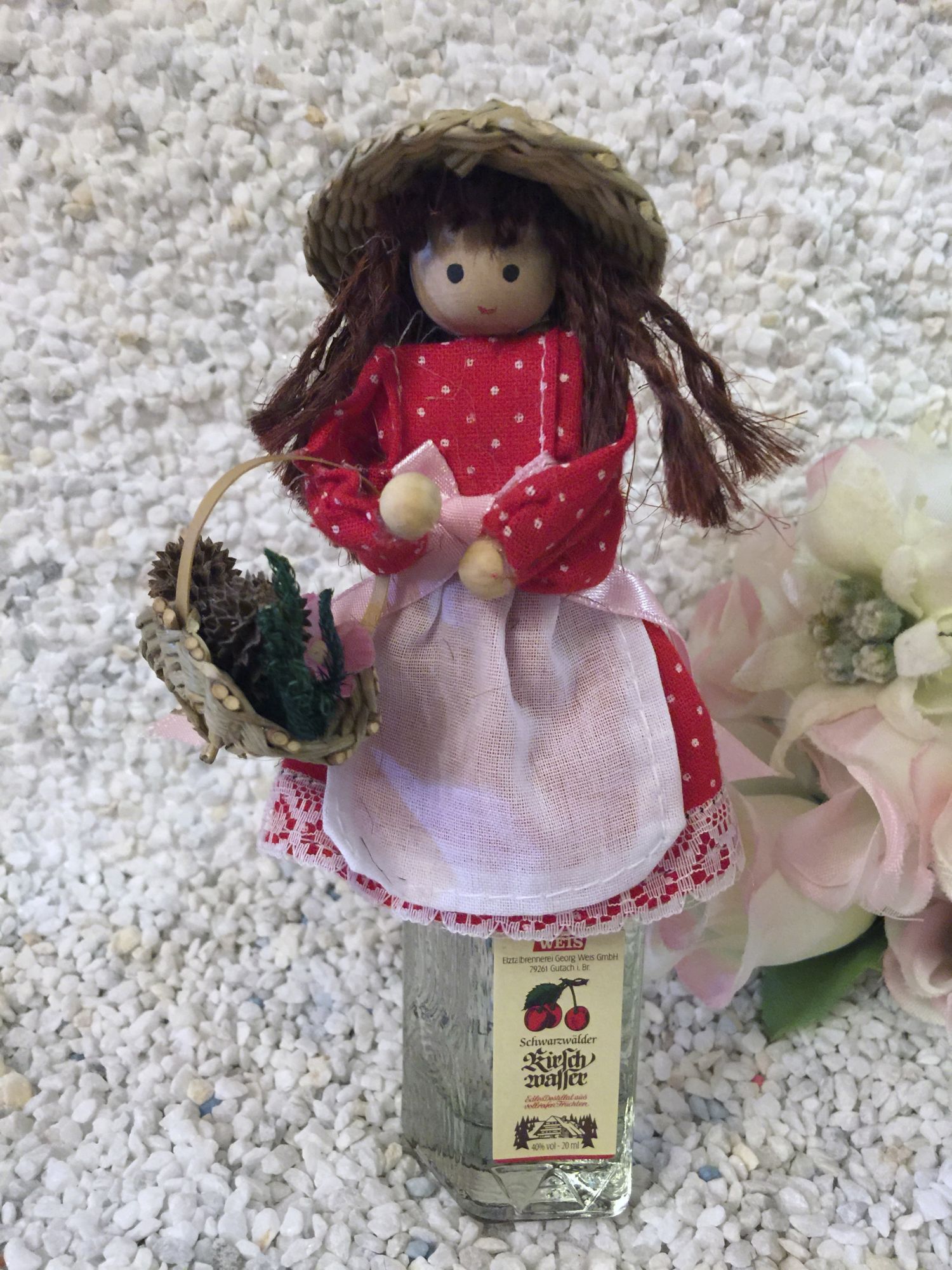Kleine gefertigte Püppchen aus Holz,Stroh und Stoff ziehren ein kleines Schnapsfläschle.
