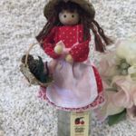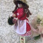 Liebevoll von Hand gestaltete Püppchen mit einem Holzkopf, Haaren, Stoffkleidchen und einem Geschenkkorb.