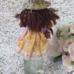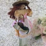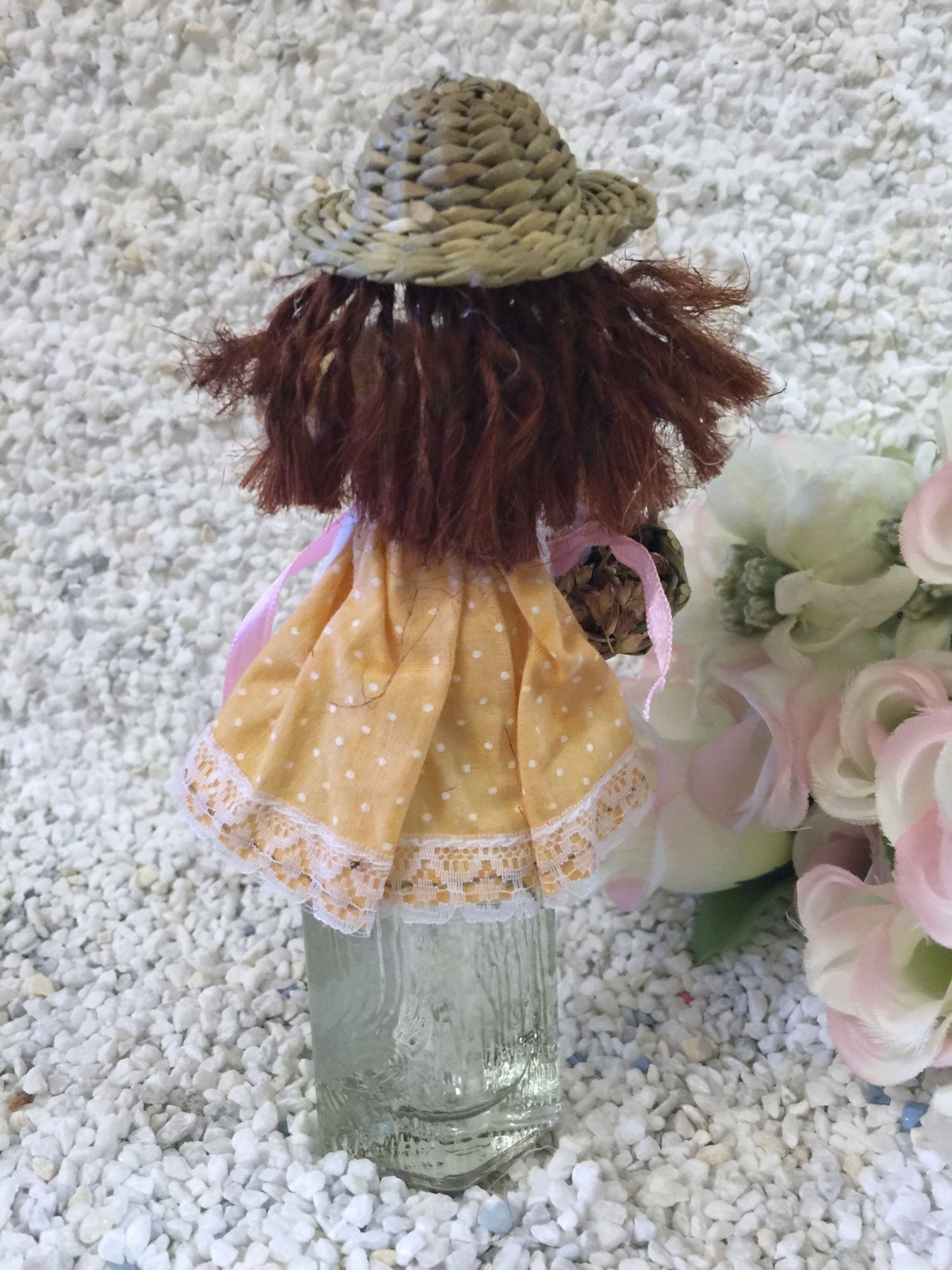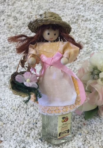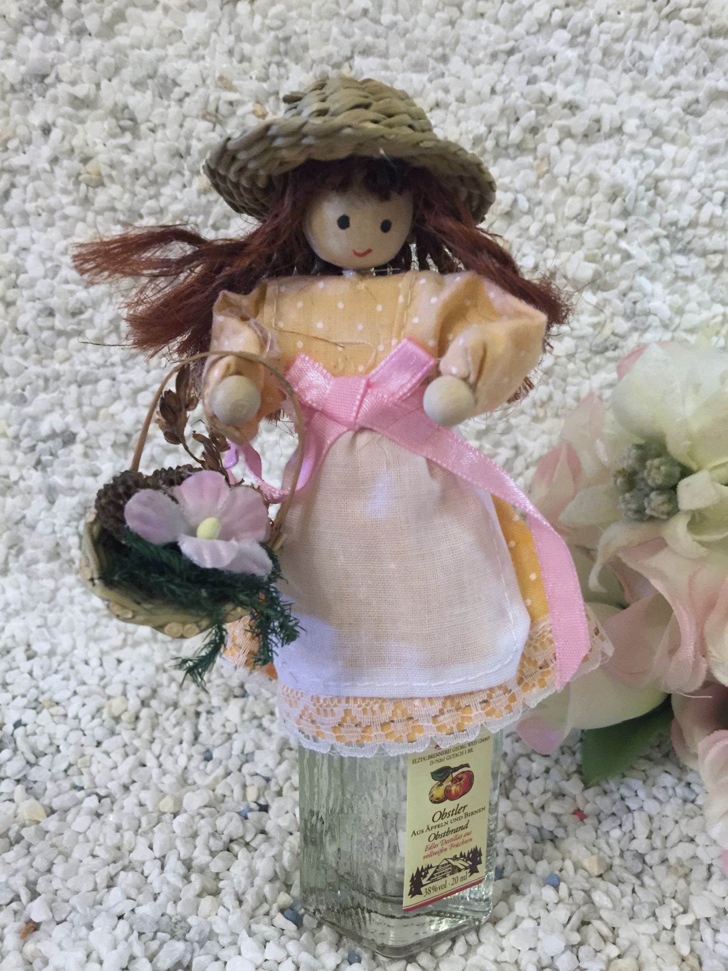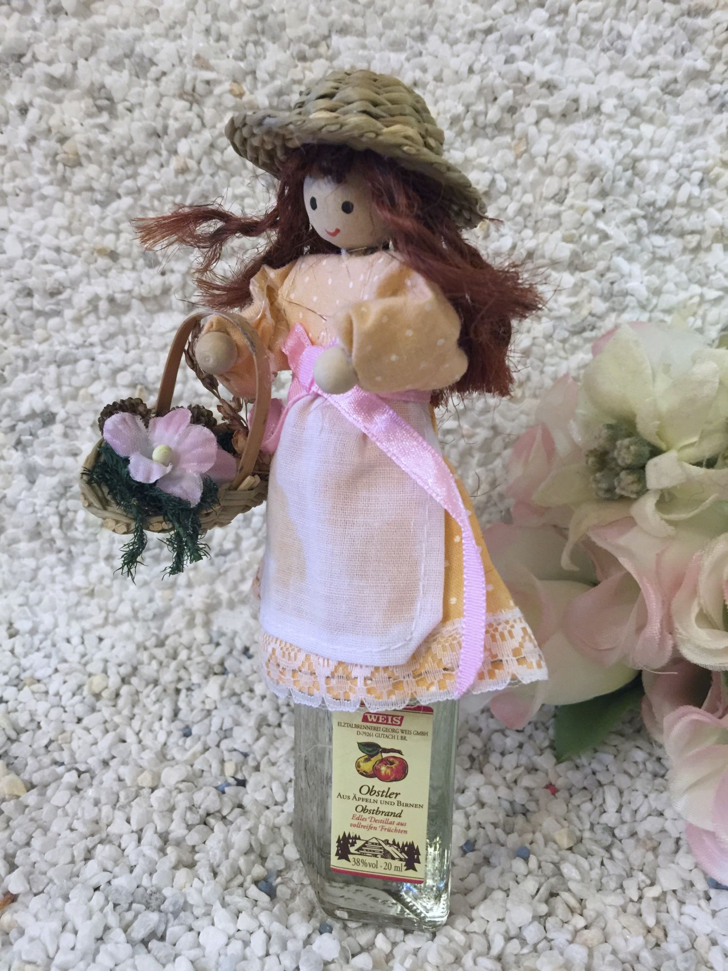 Kleine gefertigte Püppchen aus Holz,Stroh und Stoff ziehren ein kleines Schnapsfläschle.