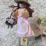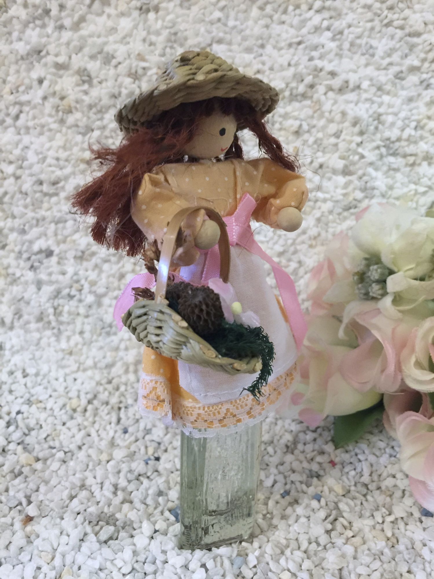 Liebevoll von Hand gestaltete Püppchen mit einem Holzkopf, Haaren, Stoffkleidchen und einem Geschenkkorb.