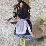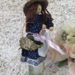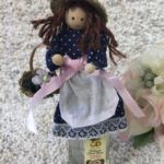 Liebevoll von Hand gestaltete Püppchen mit einem Holzkopf, Haaren, Stoffkleidchen und einem Geschenkkorb.