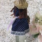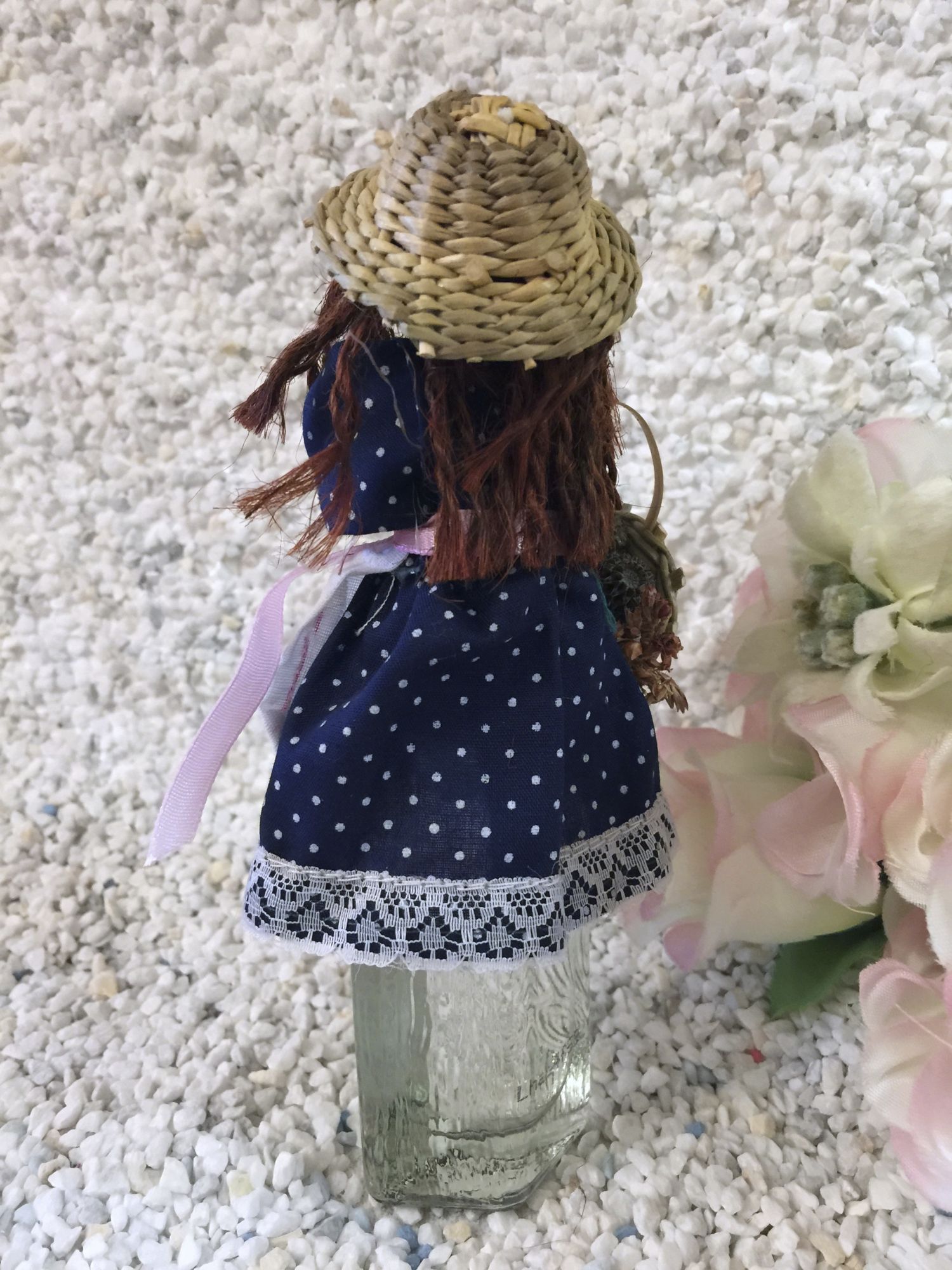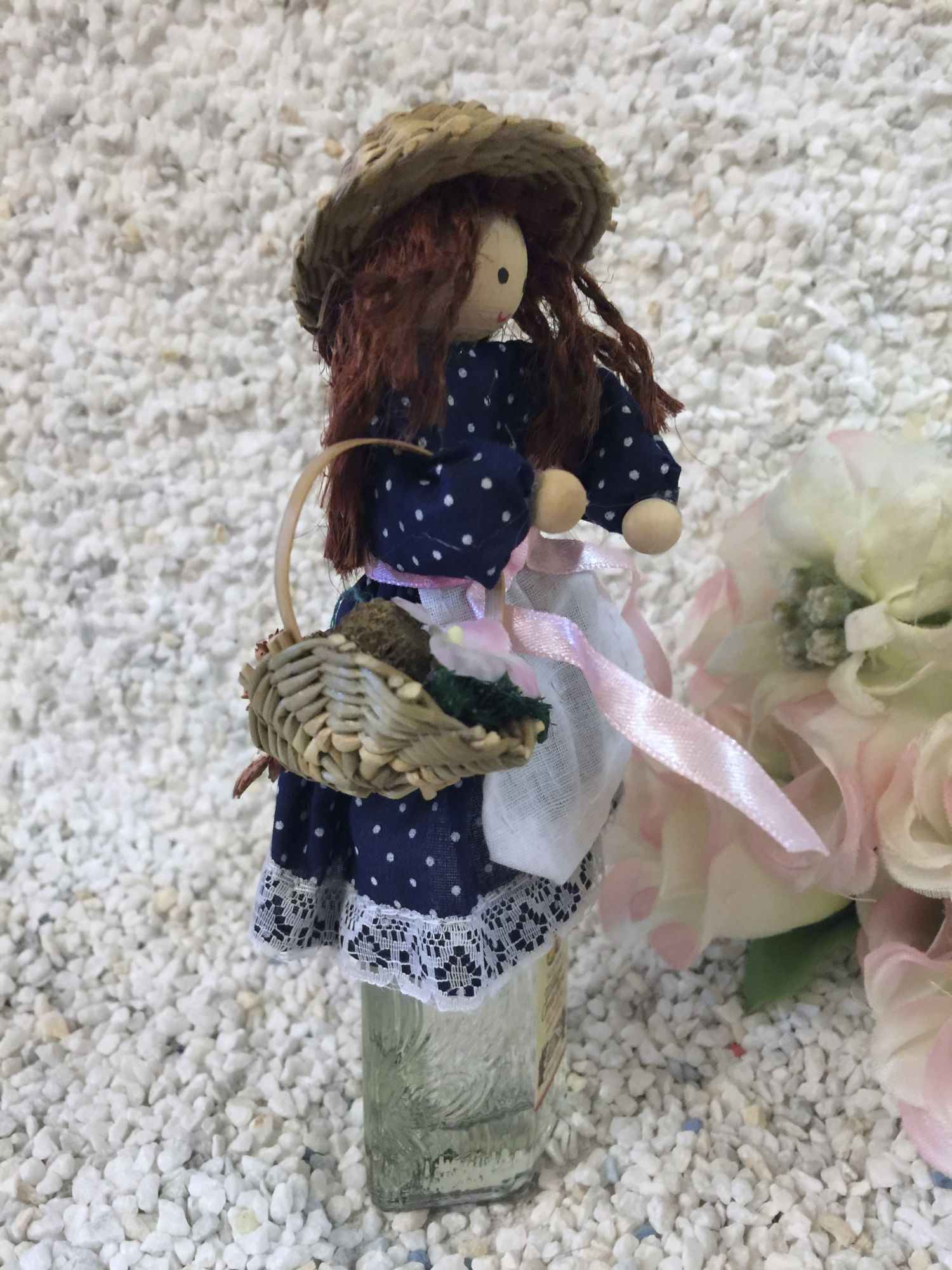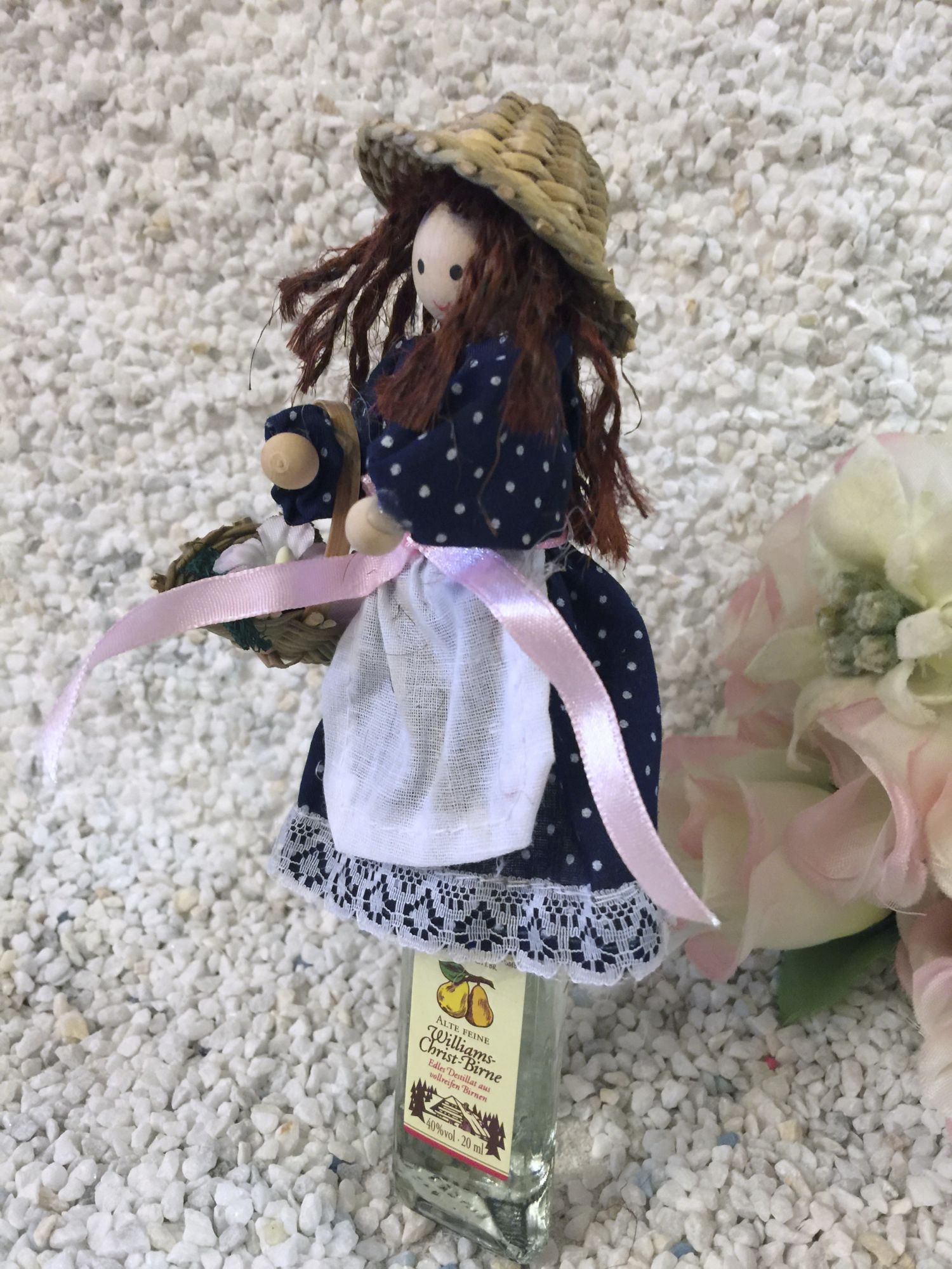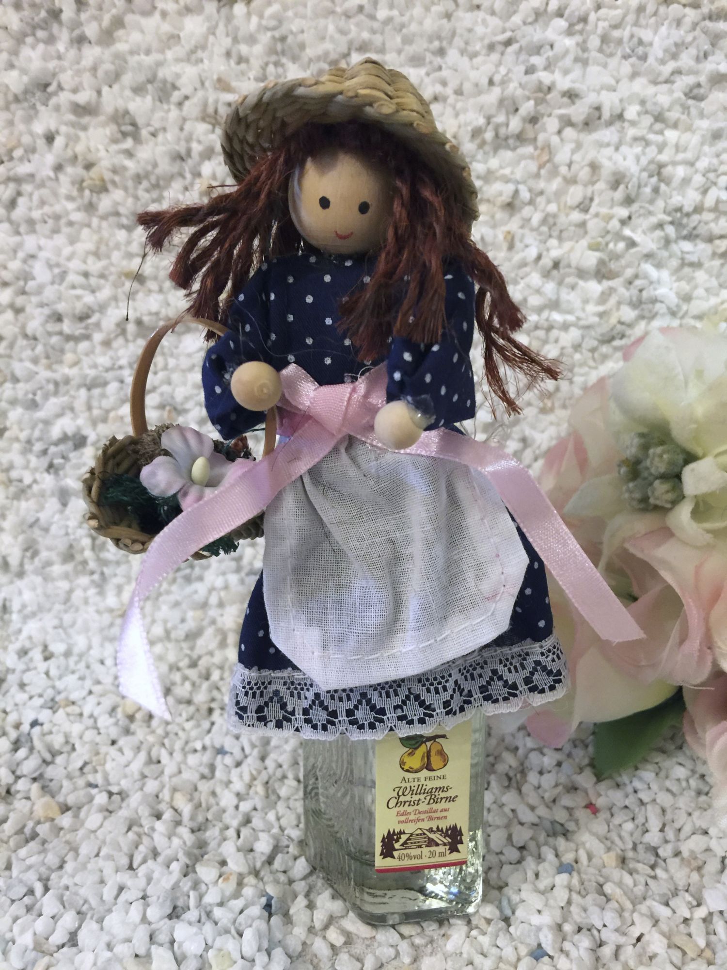 Kleine gefertigte Püppchen aus Holz,Stroh und Stoff ziehren ein kleines Schnapsfläschle.