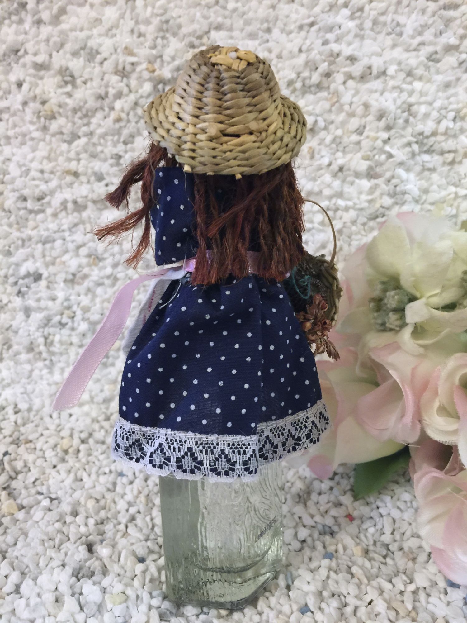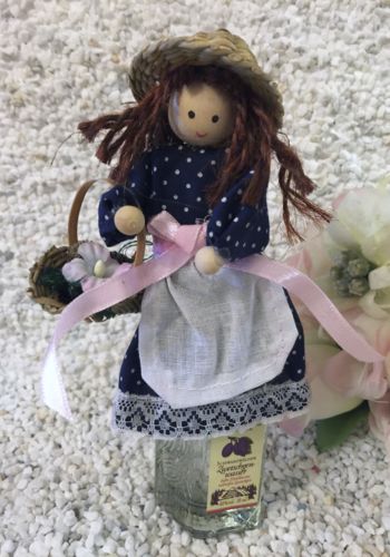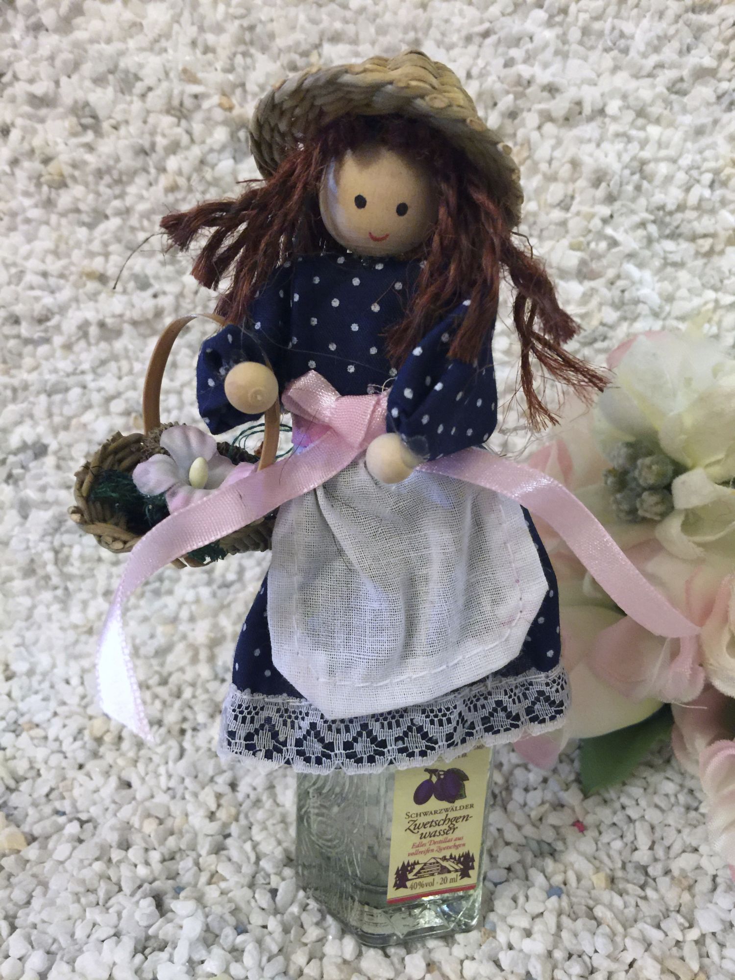 Kleine gefertigte Püppchen aus Holz,Stroh und Stoff ziehren ein kleines Schnapsfläschle.