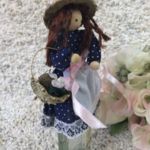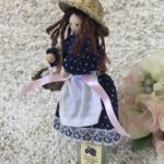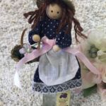 Liebevoll von Hand gestaltete Püppchen mit einem Holzkopf, Haaren, Stoffkleidchen und einem Geschenkkorb.