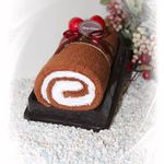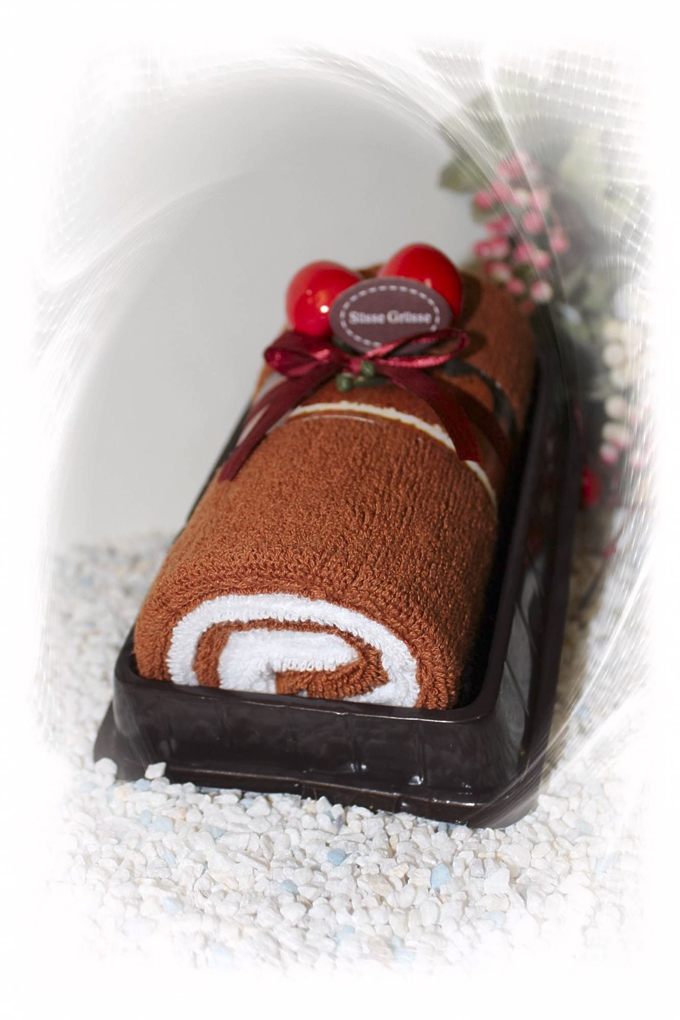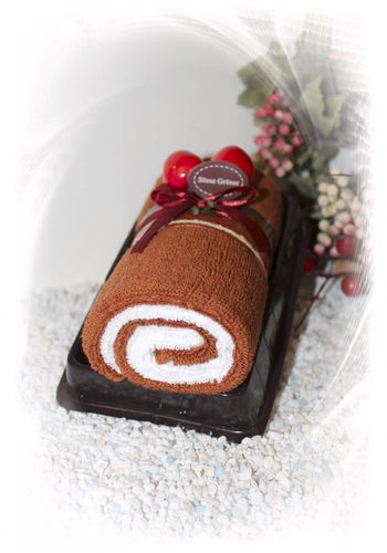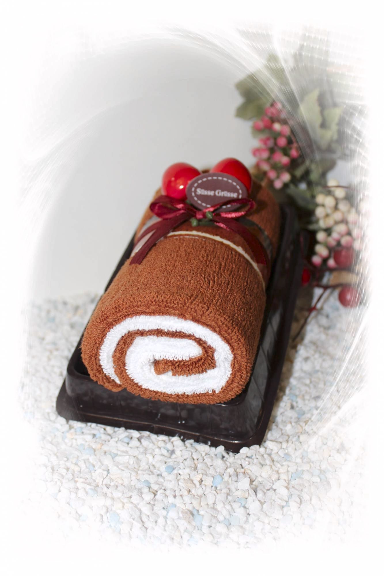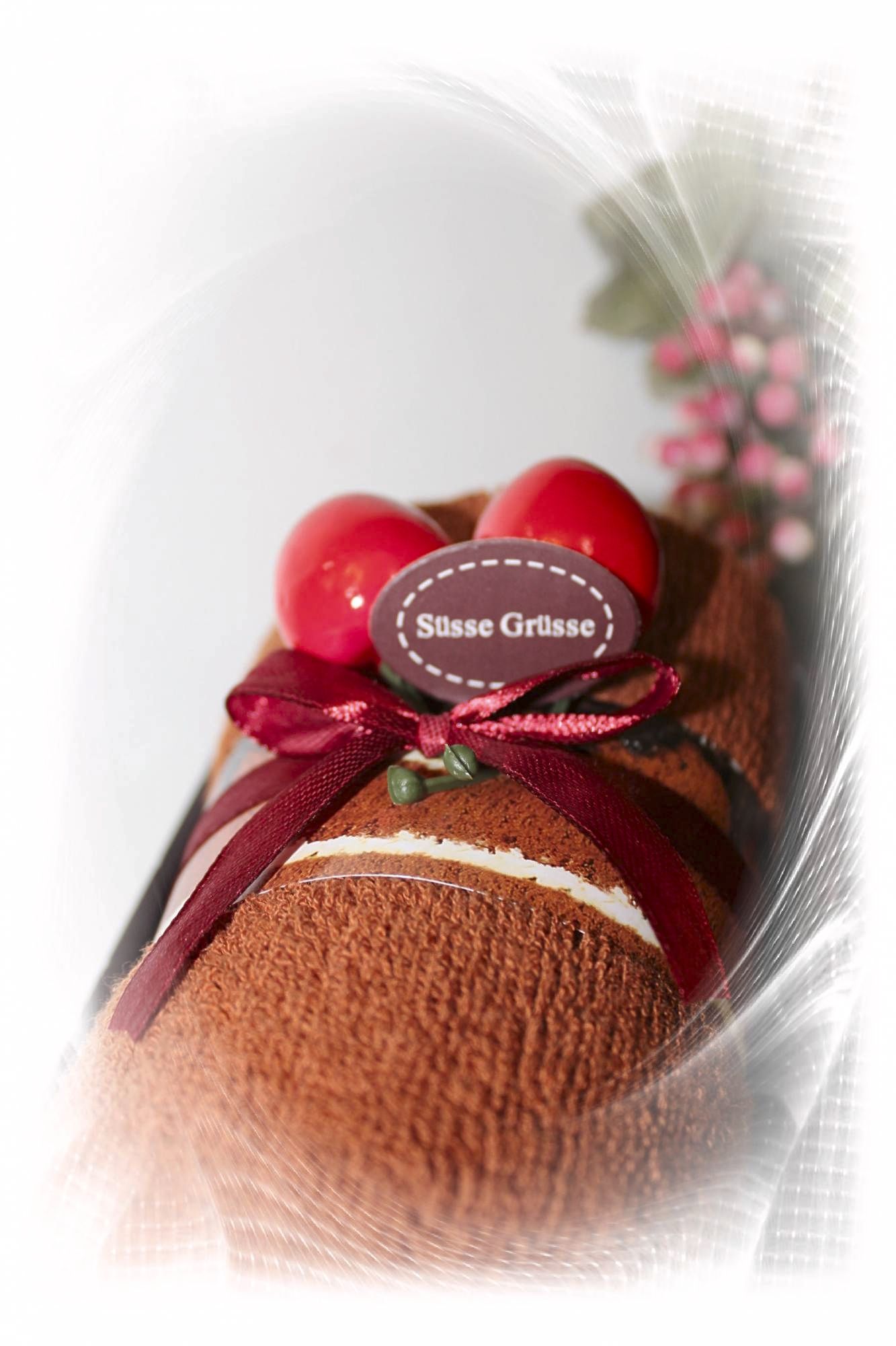 Eine Schwarzwälder Kirschrolle in Form von zwei Handtüchern