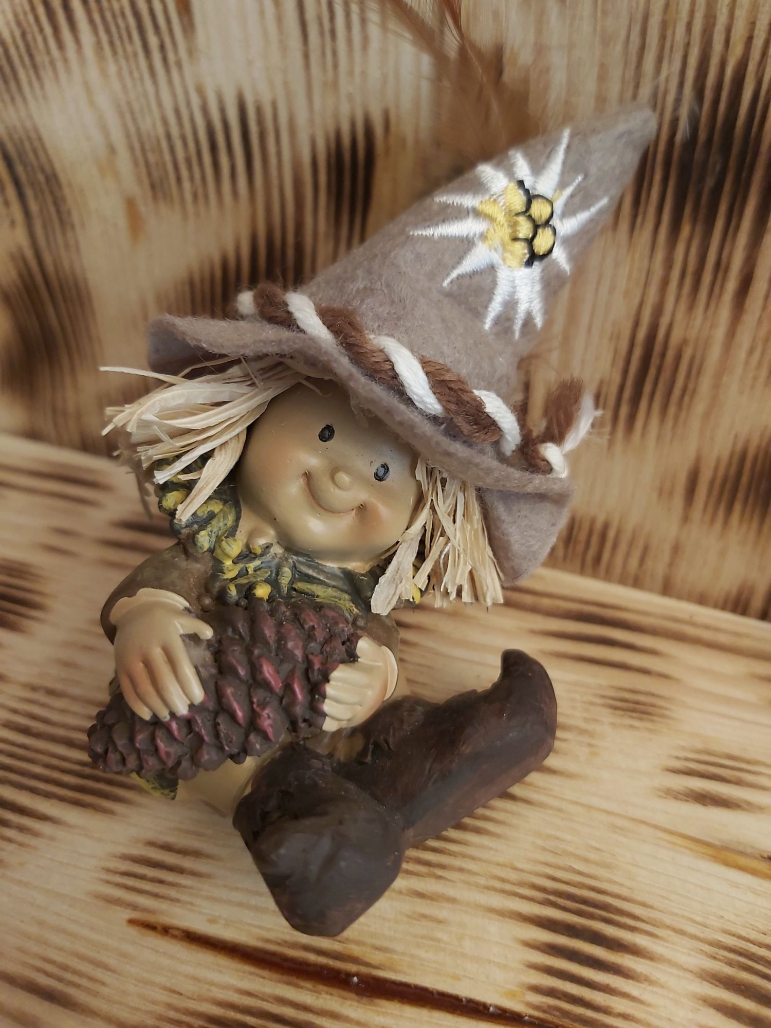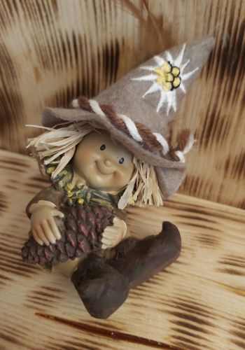mit Filzhut und Tannenzapfen sitzend