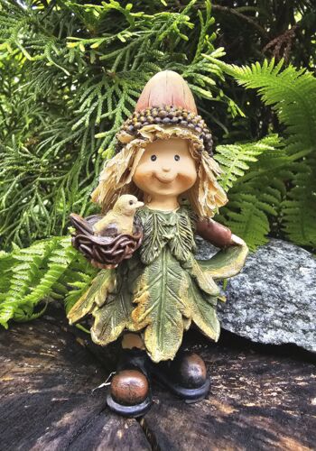 Ganz bezaubernde Waldwichtele mit Eichelhut und einem süßen Vogel in der Hand.