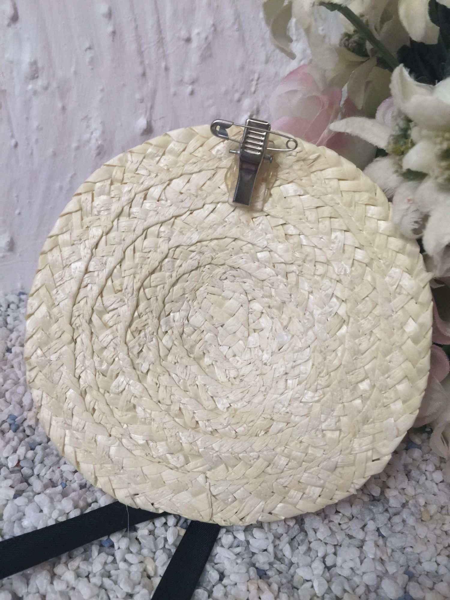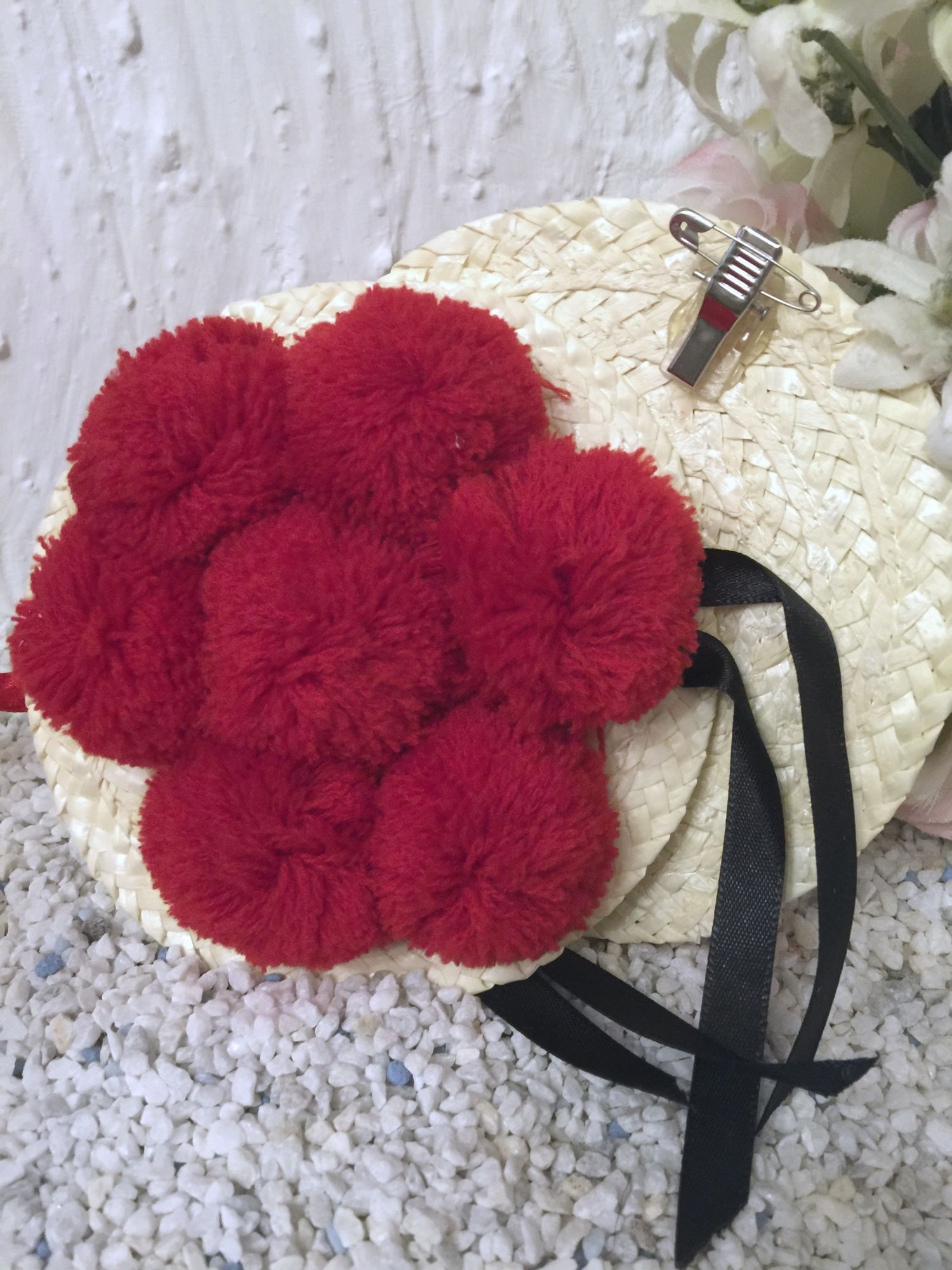 Kleiner Bollenhut mit Schwarzer Schleife und rotem Band sowie einer Klammer und Nadel.