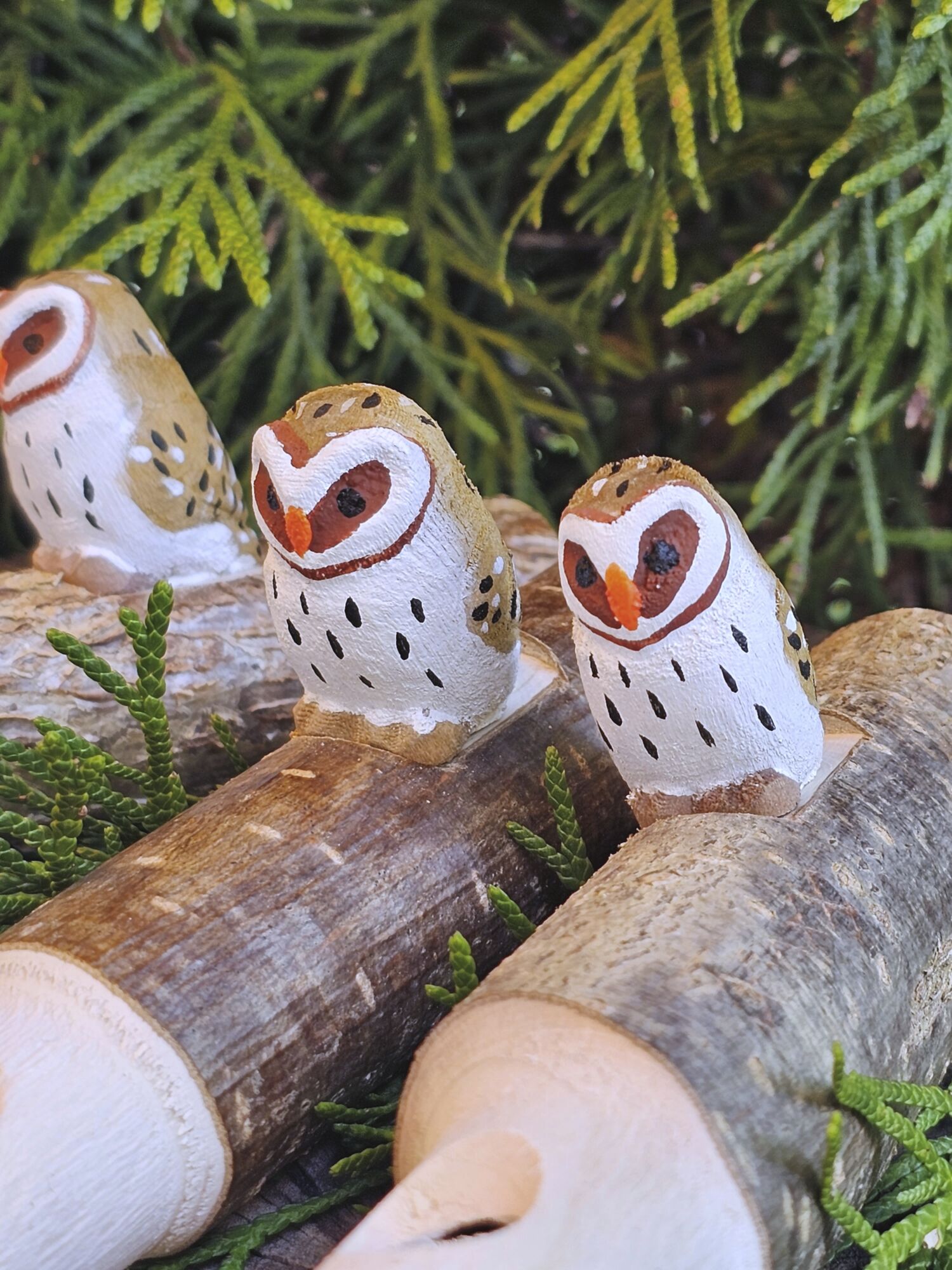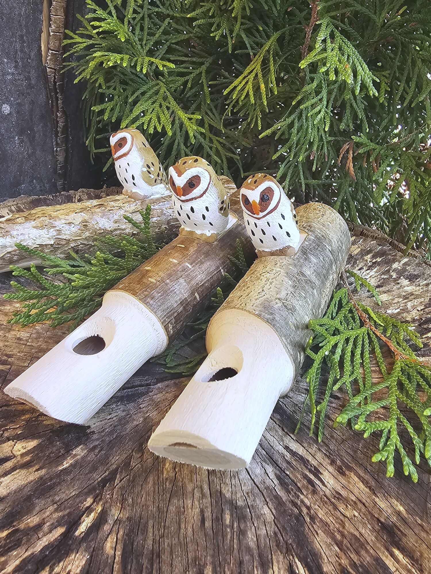 Handgefertigte Kuckuckspfeifen aus echtem Holz gefertigt mit einer ebenfalls handgeschnitzter Eule aus Holz.