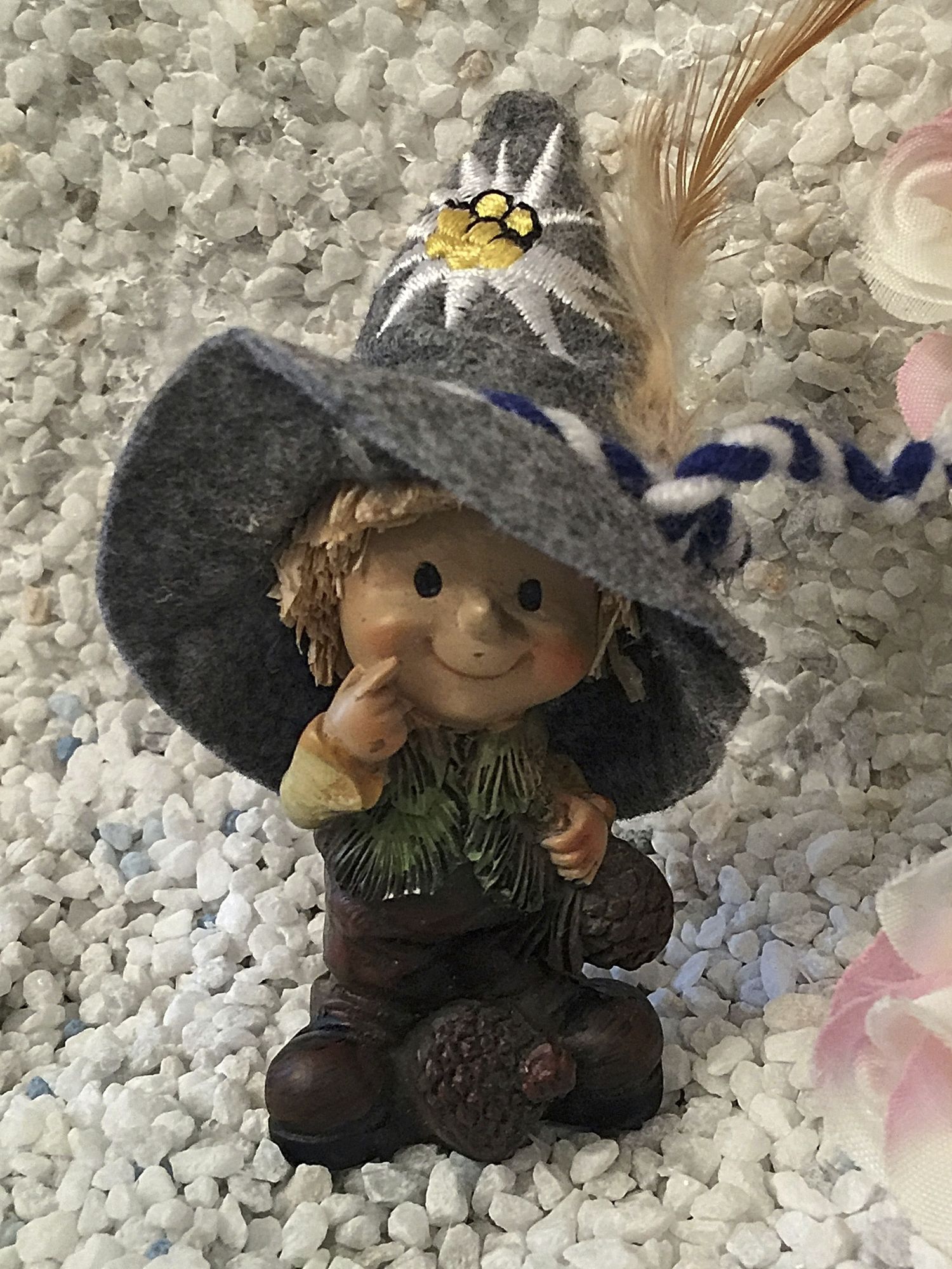 Hier zeigen wir Ihnen einen sehr schön gefertigten kleinen Wichtel, handbemahlt mit traditionellem Fest-Spitzhut aus Filz, Federn und blauer Kordel.
