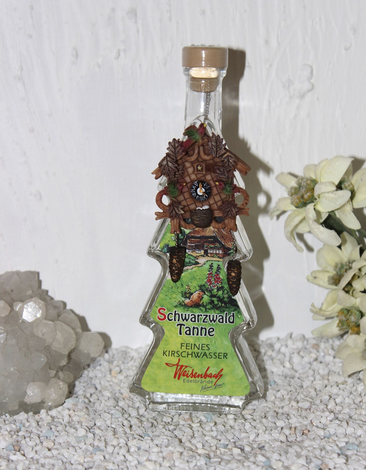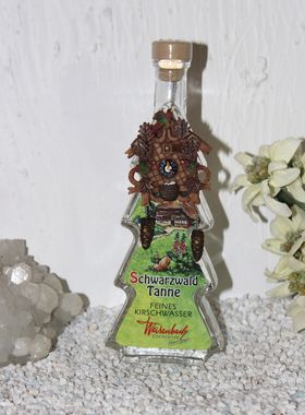 Die Tannenflasche ziert eine liebevoll gefertigte und handbemahlte Schwarzwälder Kuckucksuhr.