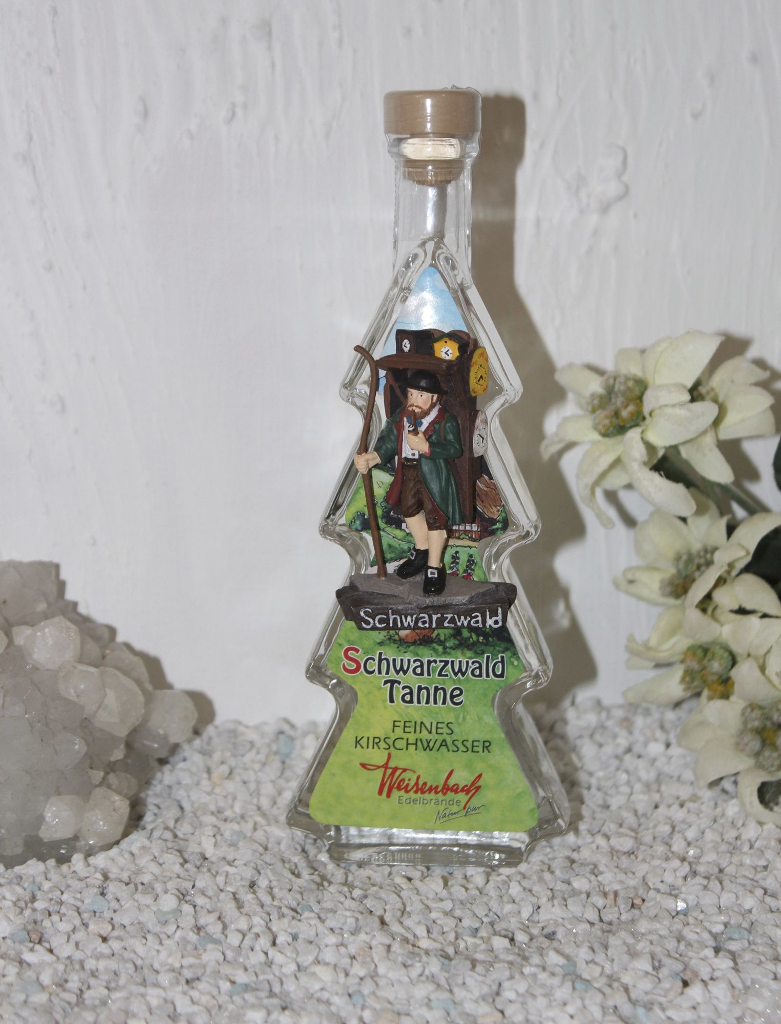 Die Tannenflasche ziert ein liebevoll gefertigter und handbemahlter Schwarzwälder Uhrenträger