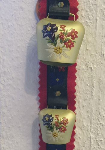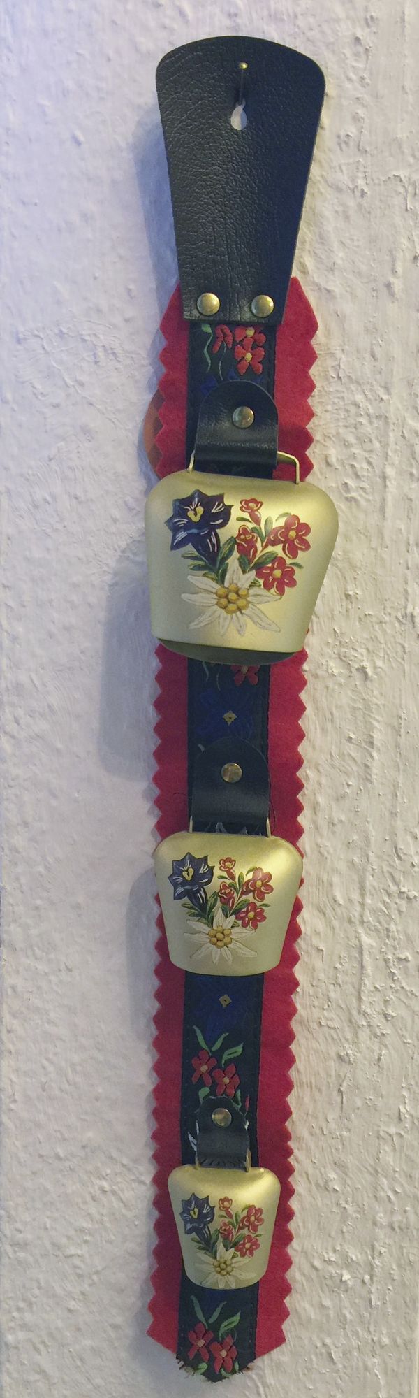 Drei verschieden große Glocken mit Alpenmotiv, auf doppeltem Stoffstrang.