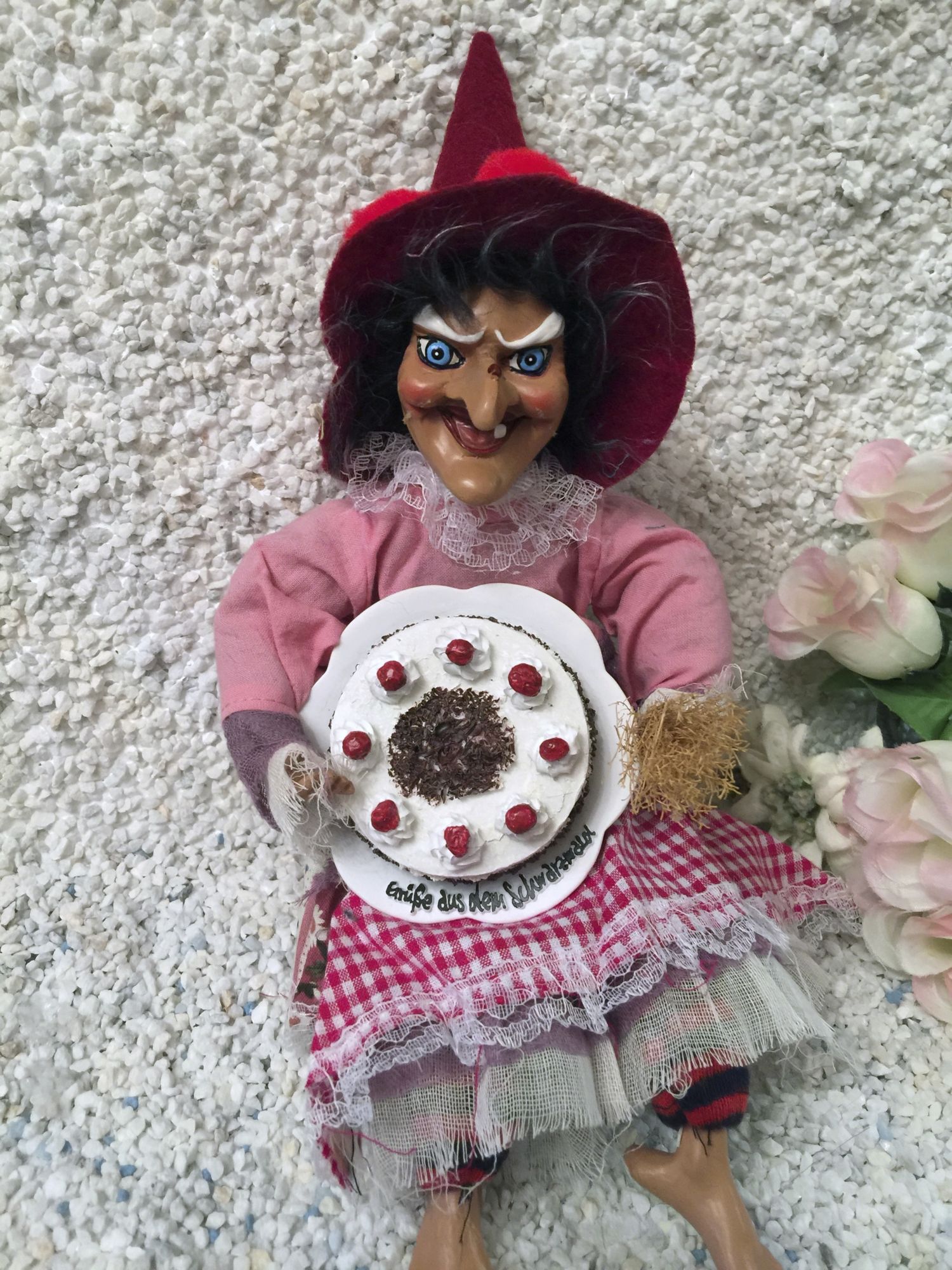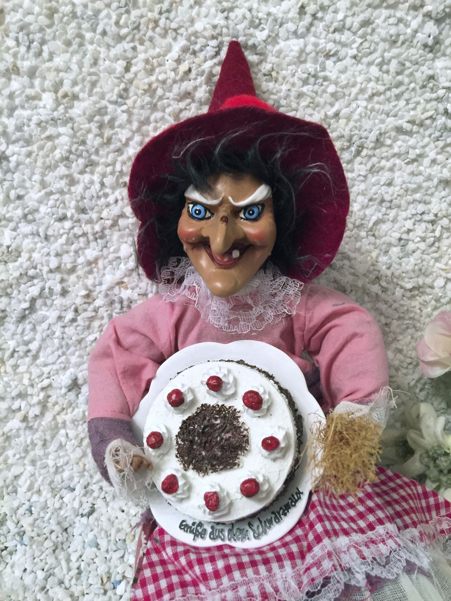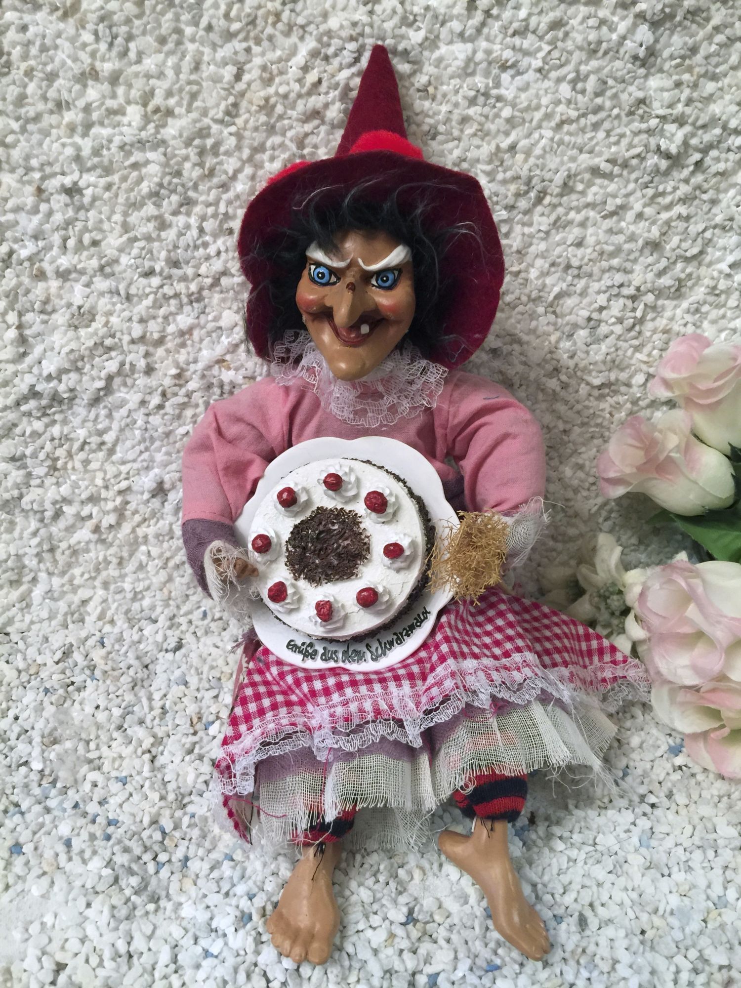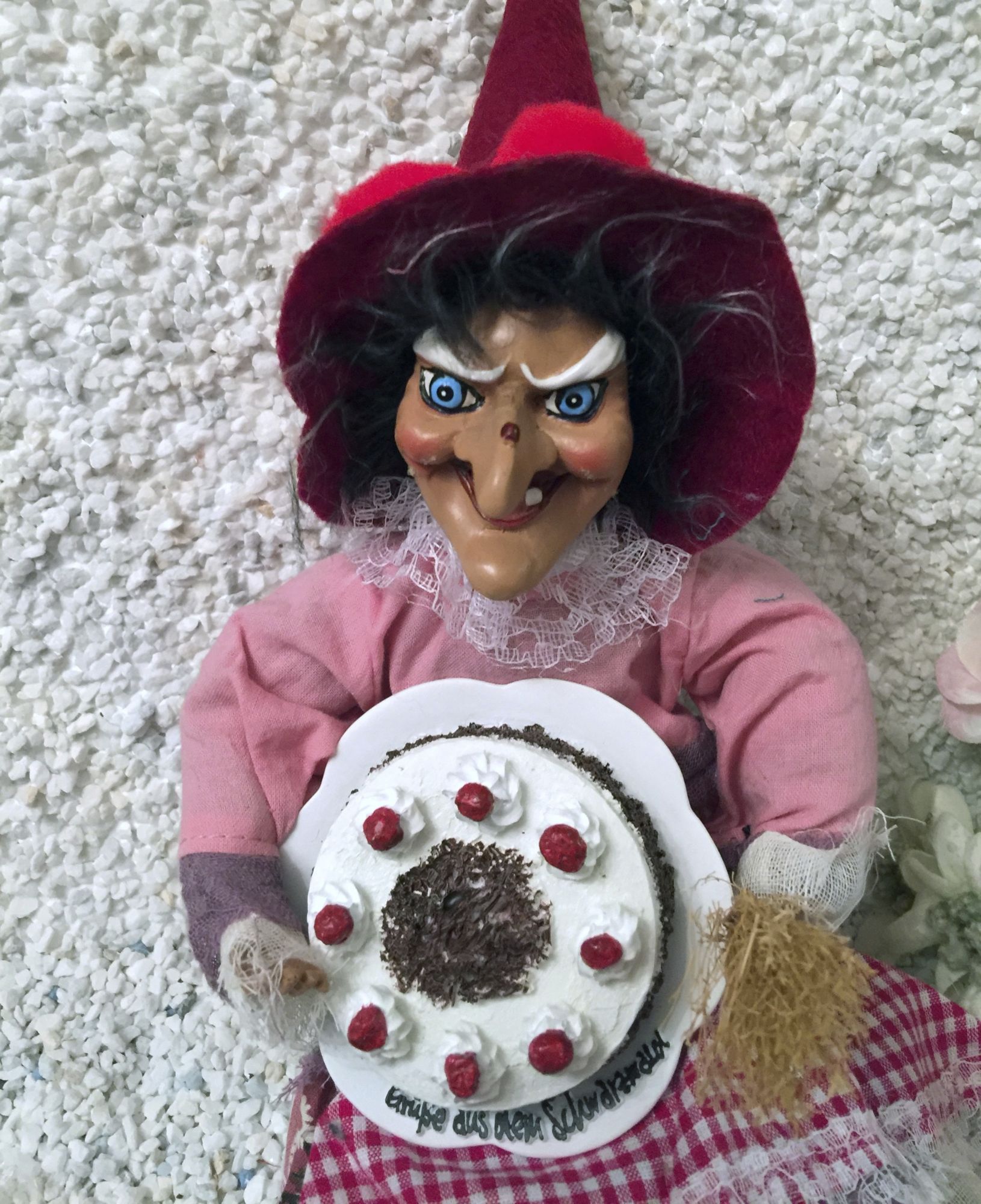 Hier zeigen wir Ihnen eine fetzig rustikale Hexe mit Spitzhut und roten schwarzwälder Bollen, das Zeichen des Schwarzwaldes.