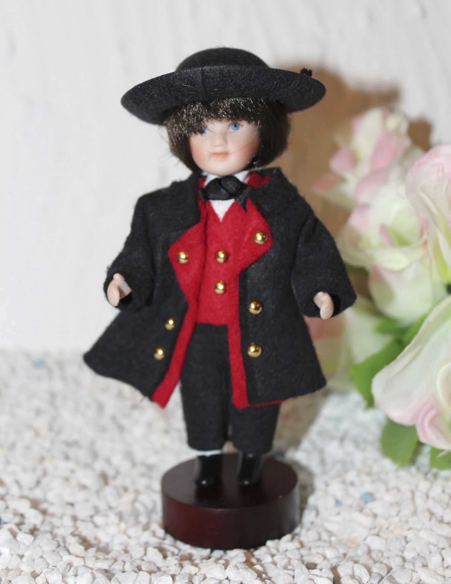 Hier zeigen wir Ihnen einen typischen Schwarzwaldbub mit schwarzem Frack, roter Weste und Goldknöpfen, dazu die Trachtenbundhose, die weißen Strümpfe und die schwarzen Schwarzwaldschuhe.