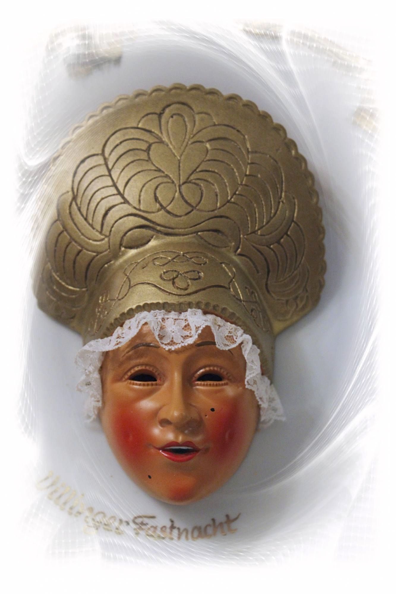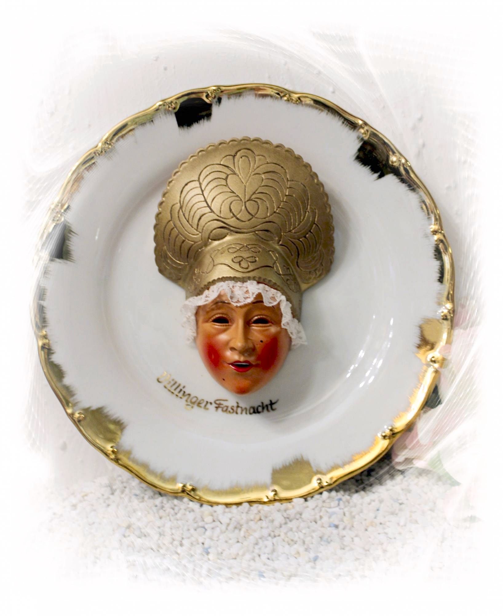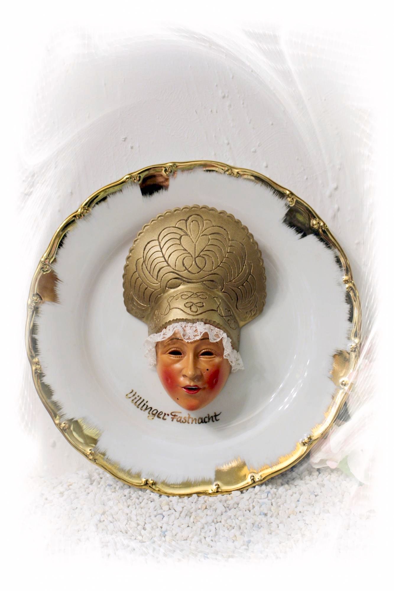 Hier ein Wandteller mit dem Mäskle der Villingerin mit der edlen Radhaube aus Villingen im Schwarzwald