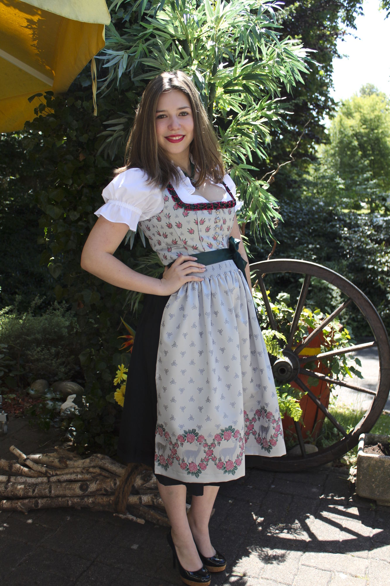 Das Gesamtbild wird perfekt abgerundet durch die silberfarbenen Knöpfen vorne und der ebenfalls seidig glänzender Schürze mit grüner Schleife, silbergrau mit edlem Druckmuster edler Rosen, Ton in Ton, sowie in grün und weinrosa mit silberfarbig schattierenden Hirschen.