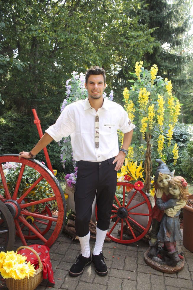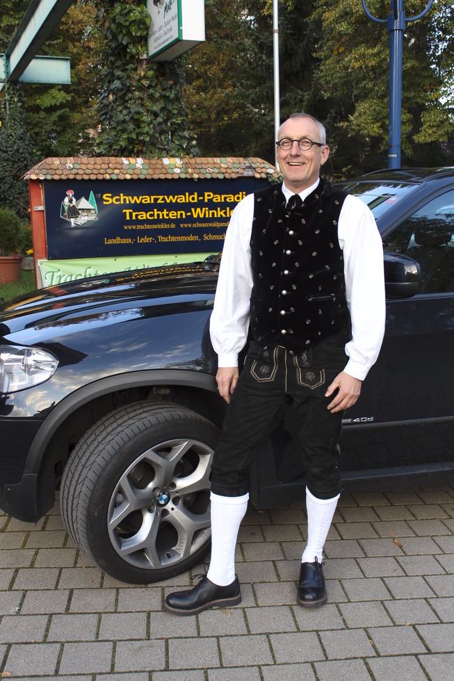 Lederhose, Hemd und fetziger Weste.