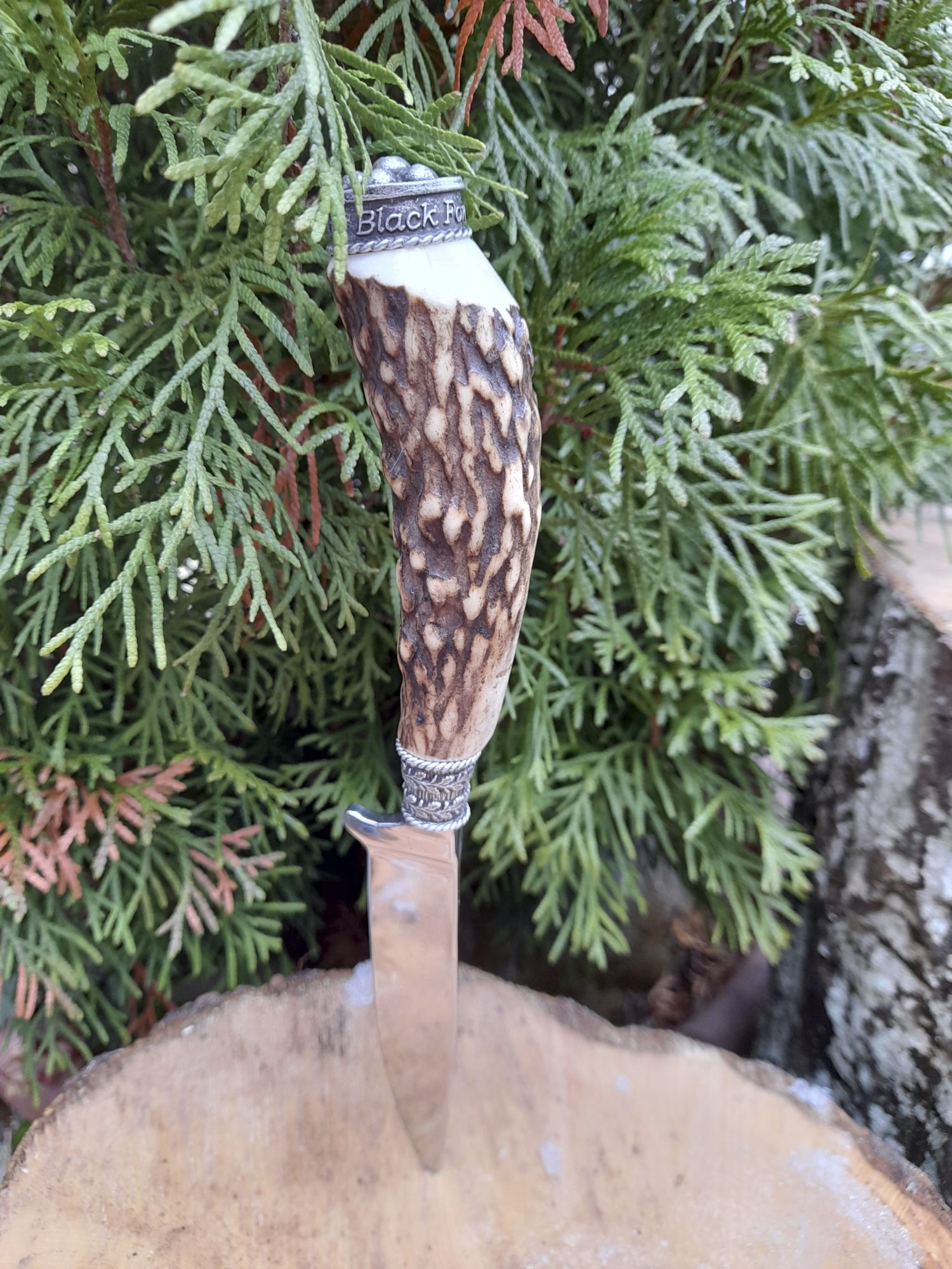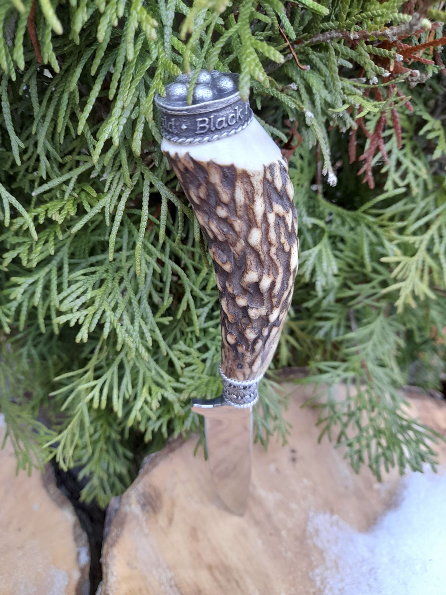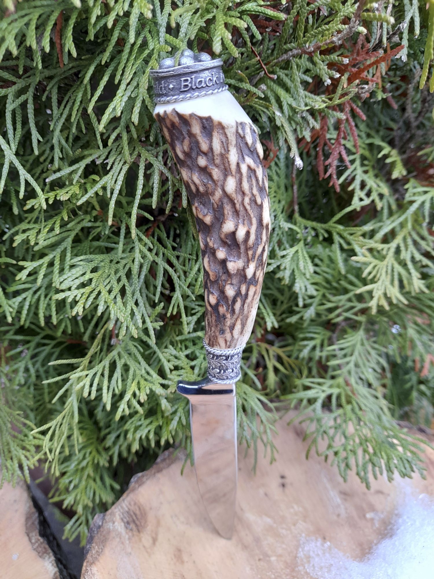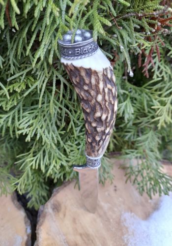 Trachtenmesser, Hirschhorngriff, Klinge 100 mm Rostfrei hochglanzpoliert, Zierkappe Schwarzwälder Bollenhut und