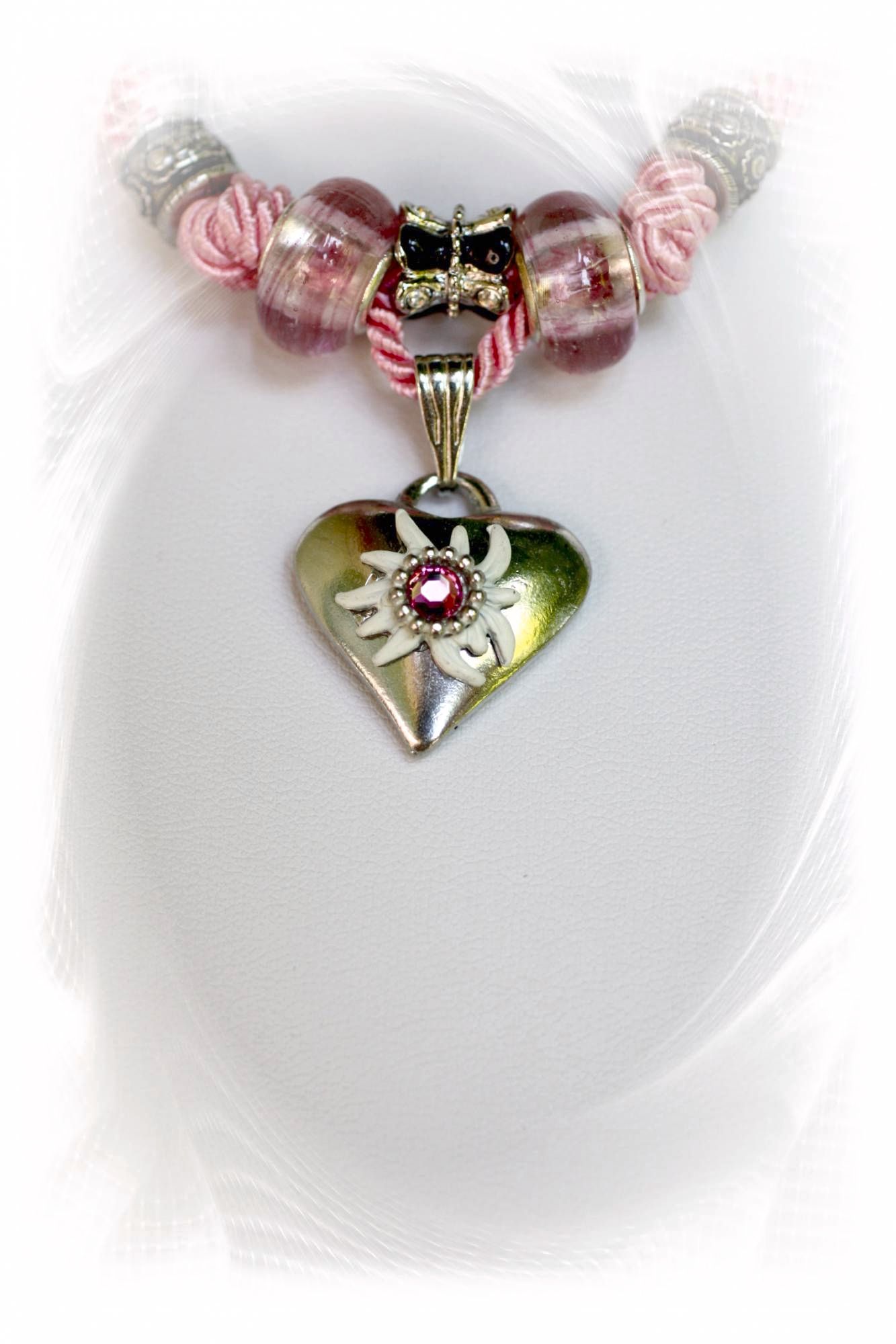 Der Herz-Anhänger mit Edelweiß und funkeldem Strassstein, dazu die farblich perfekt passenden Schmuckornamente und Schmuckperlen.