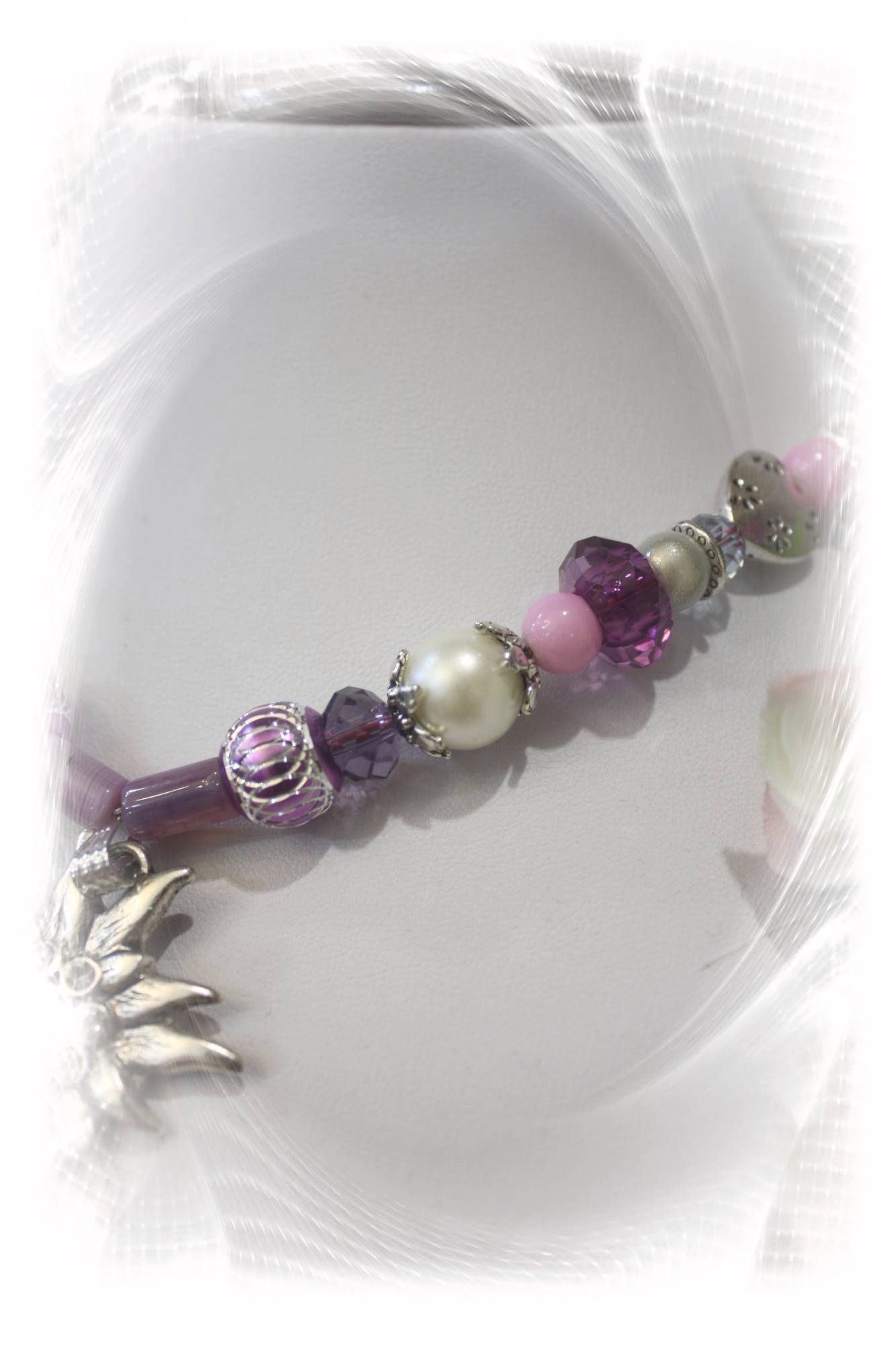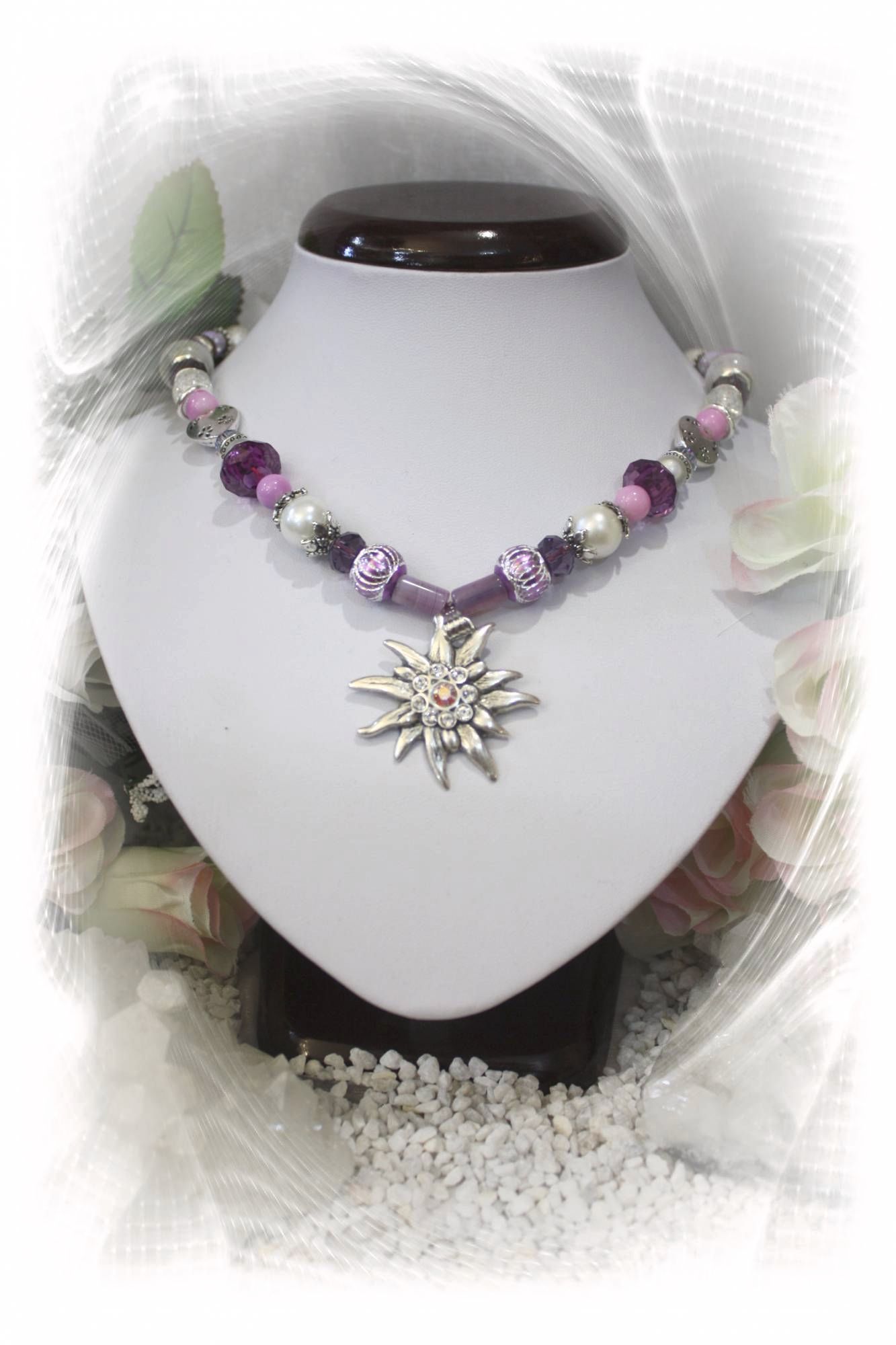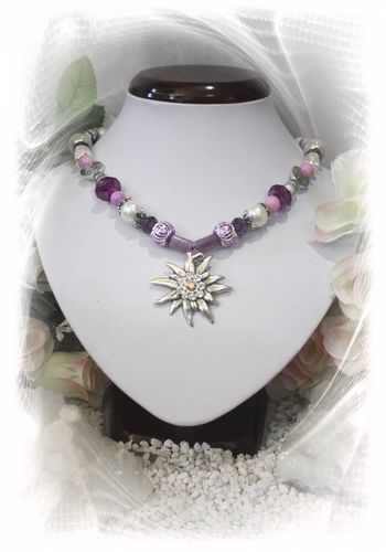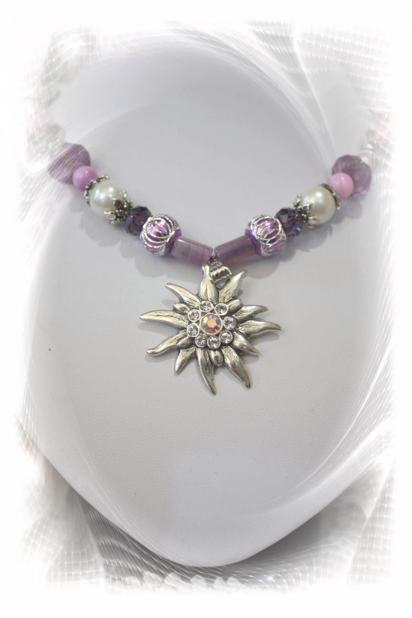 Diese Kette ist mit Schmuckperlen und einem schönen Edelweißanhänger mit funkelnden Swarovskisteinen gefertigt.