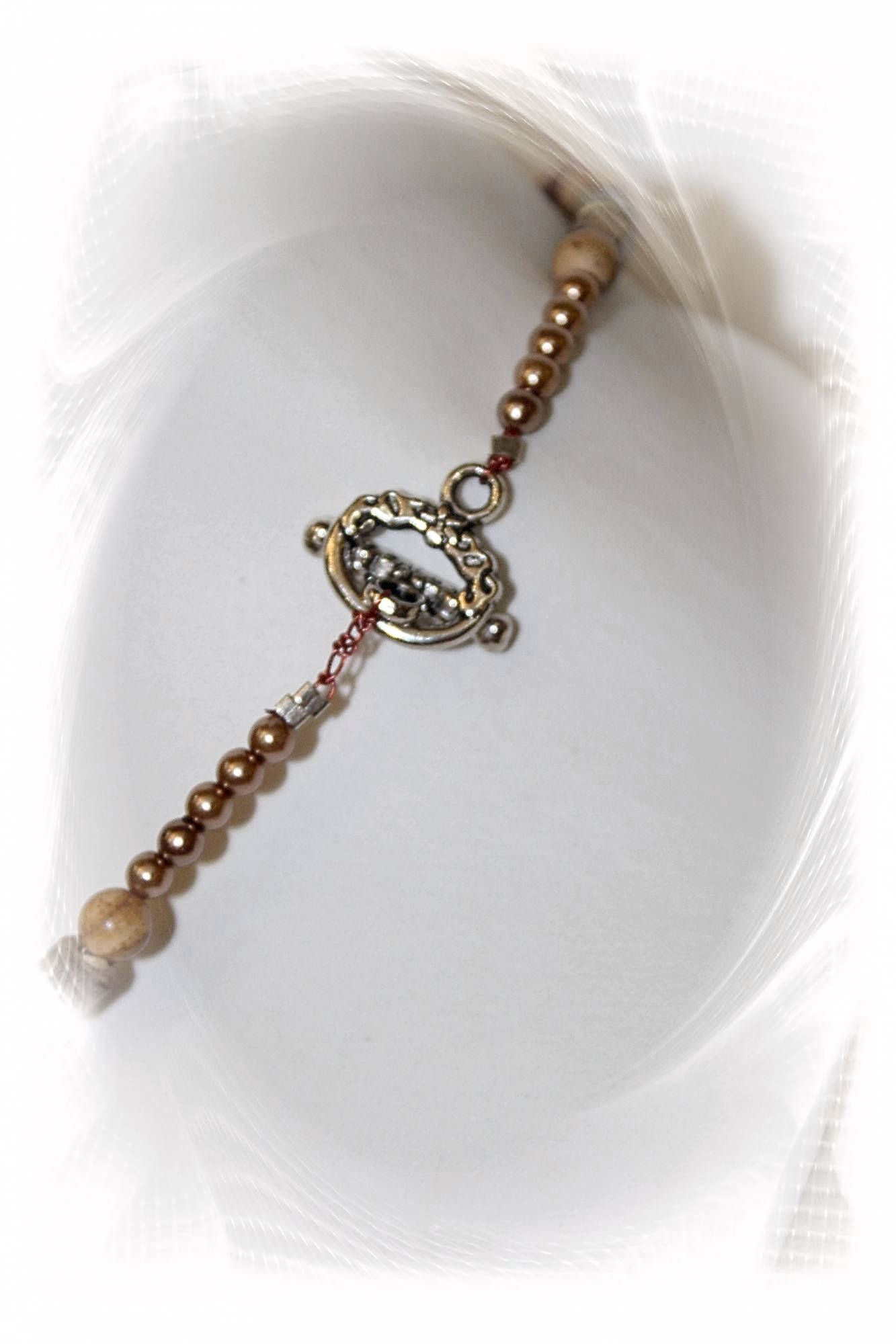Die Schmuckelemente sind auf gewachster Baumwolle aufgefädelt.