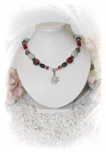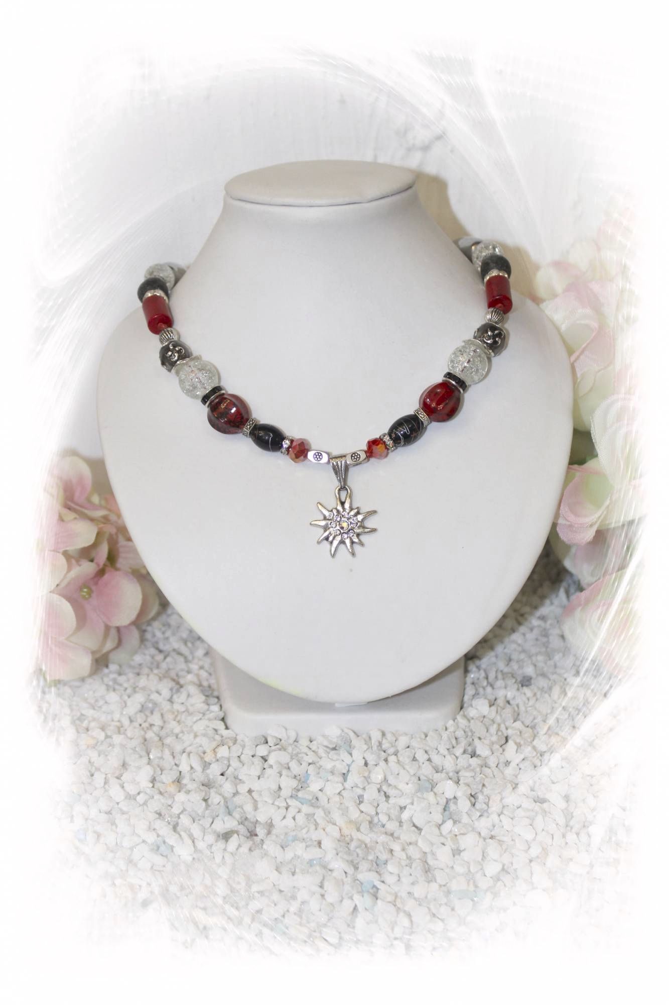 Abgerundet wird das Gesamtbild dieser edlen Kette durch vier durchsichtige irrisierenden Perlen, sowie einen ebenfalls dezenten Edelweißhänger mit echten funkelnden Swarovskisteinen.