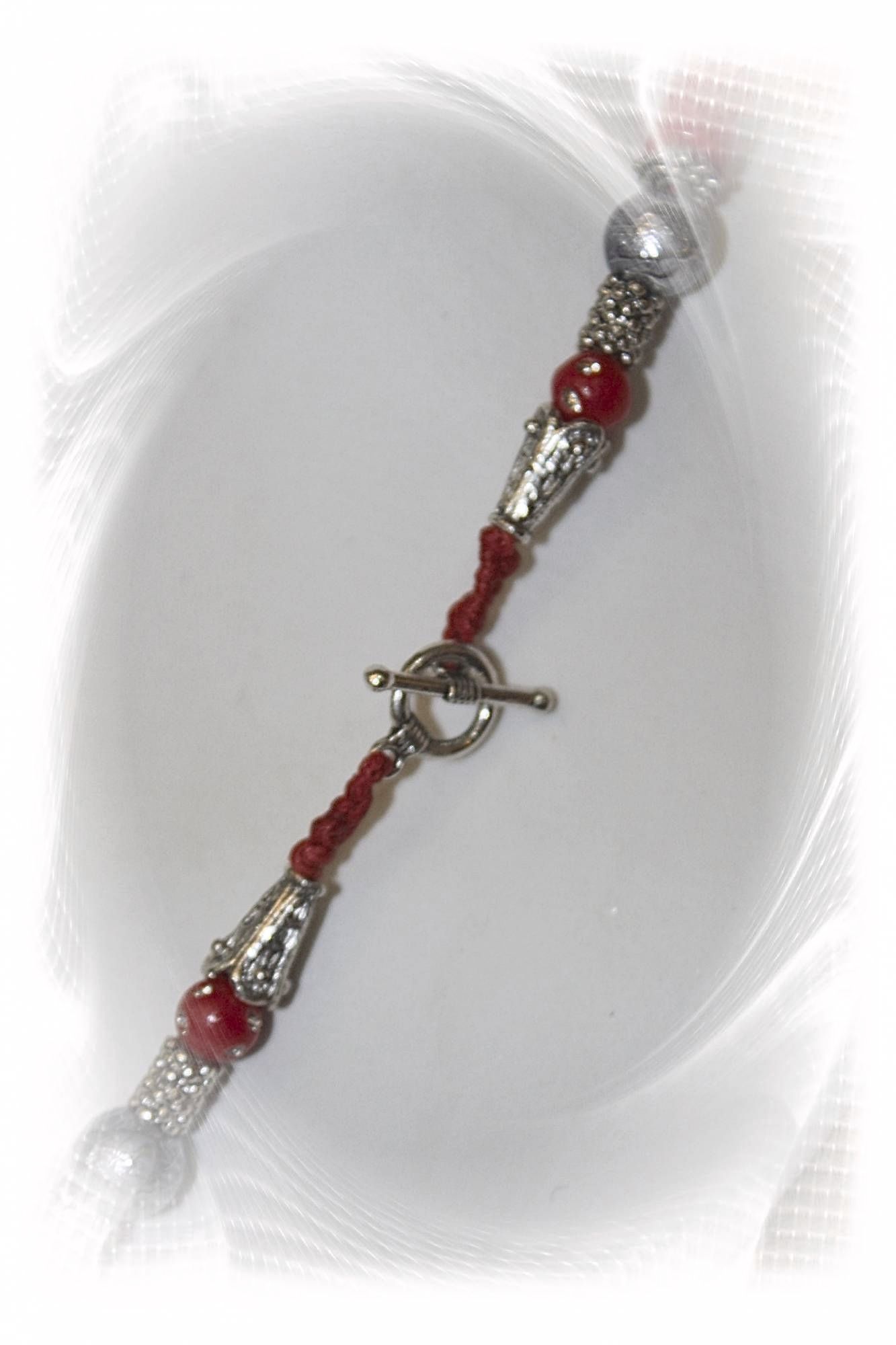 Die Schmuckelemente sind auf gewachster Baumwolle aufgefädelt.