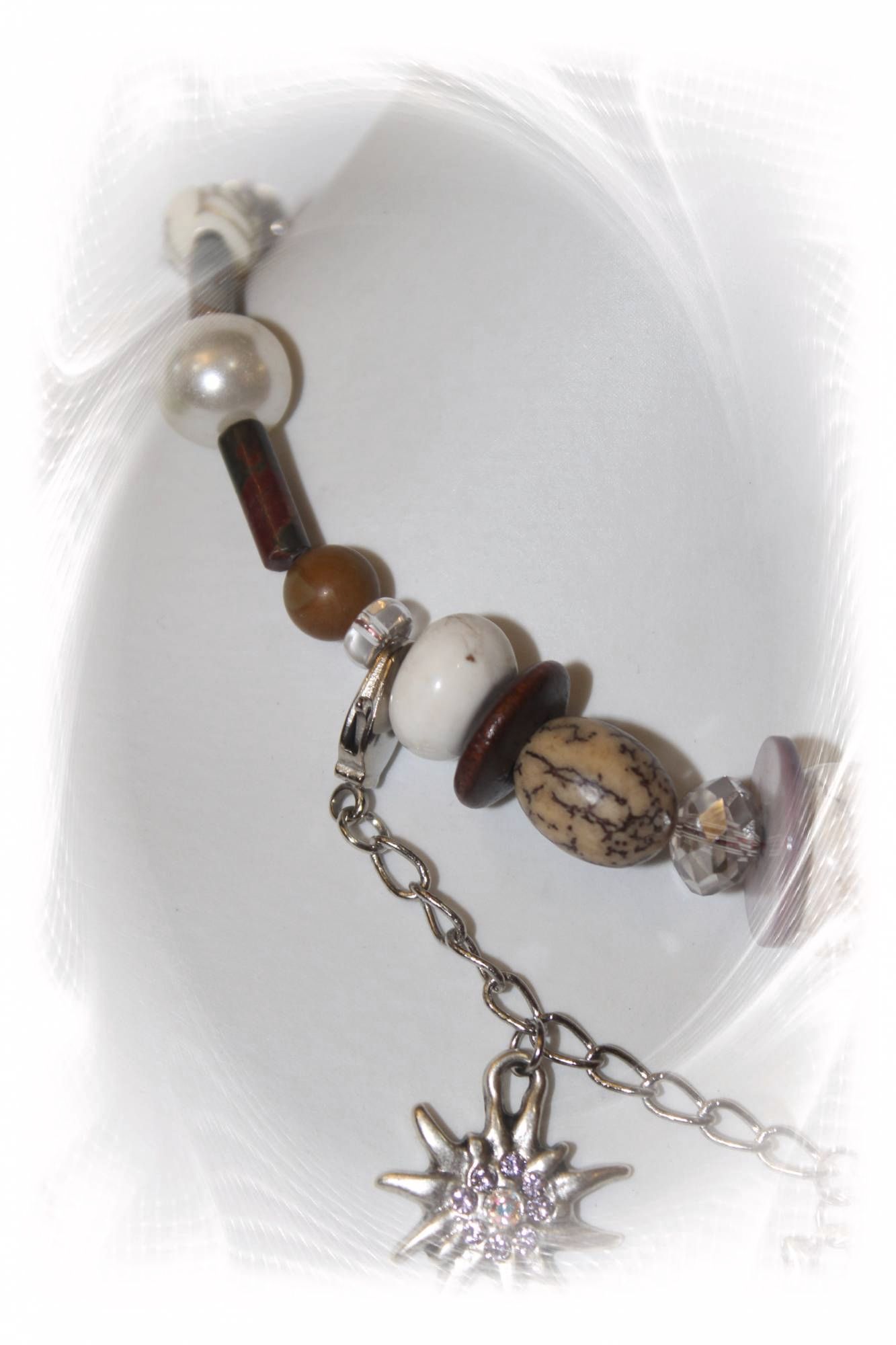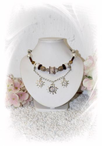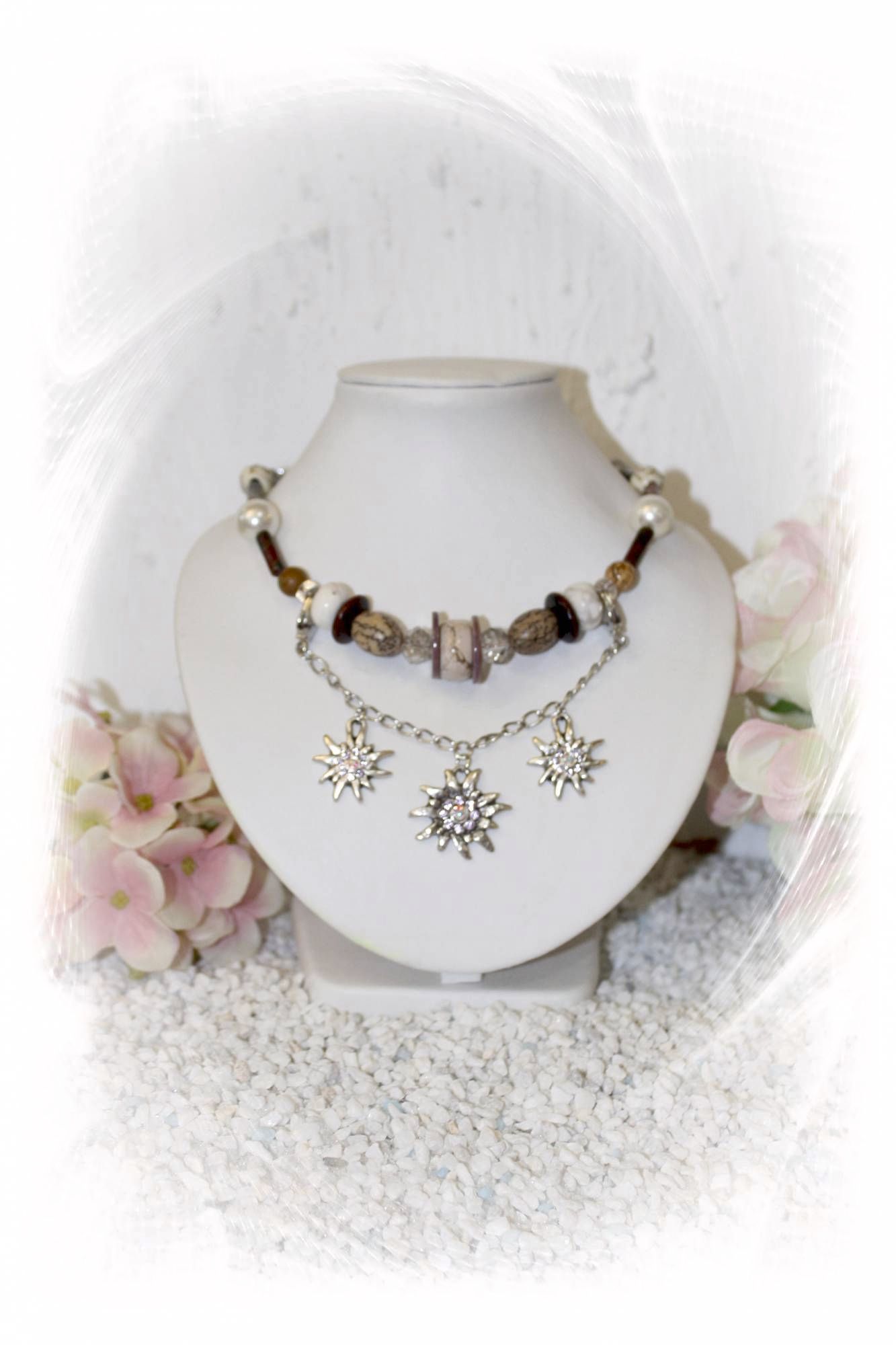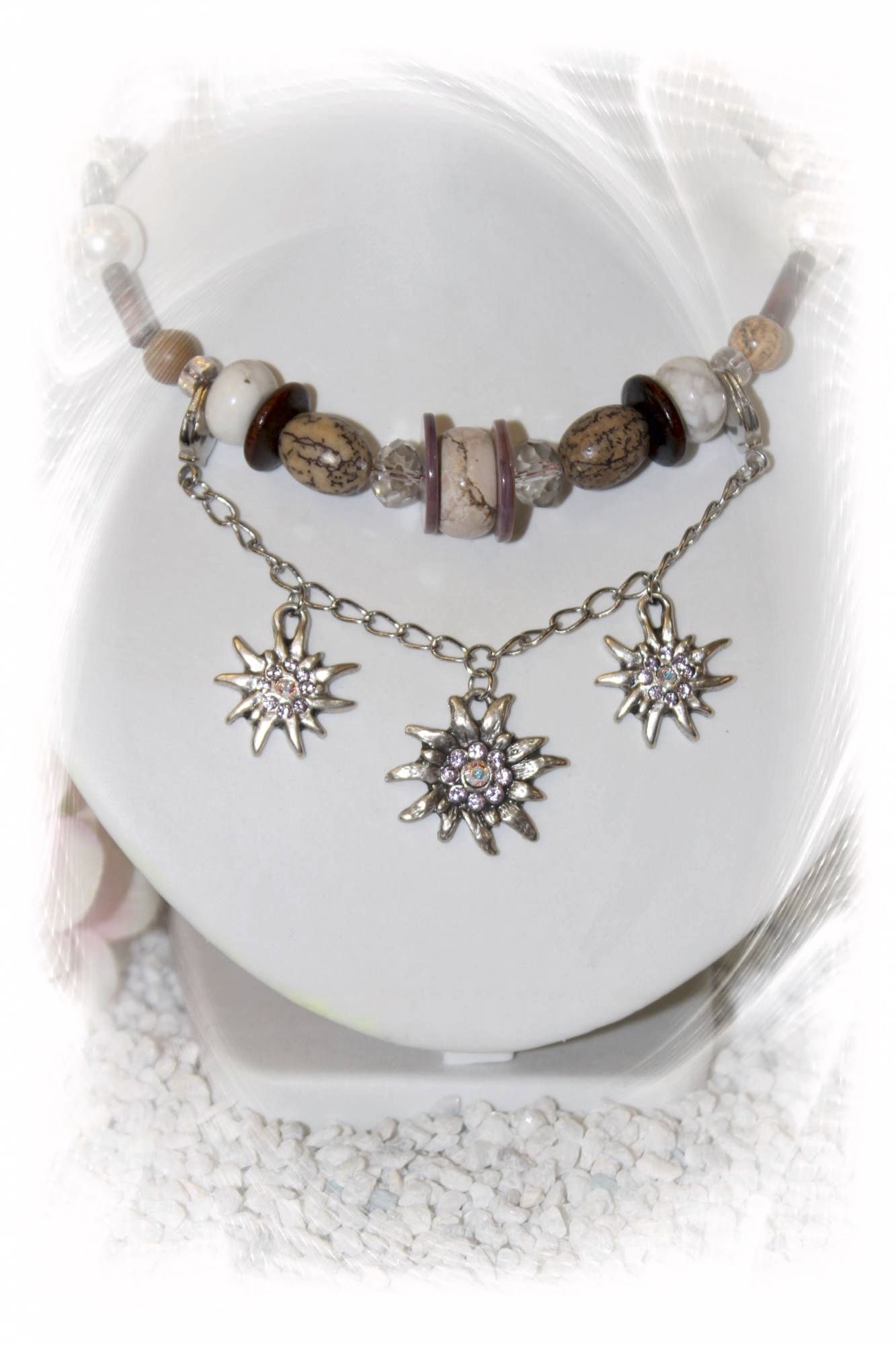 Abgerundet wird das Gesamtbild dieser edlen Kette durch den schönen Charivarianhänger mit drei Edelweiß und echten funkelnden Swarovskisteinen in kristall und flieder.