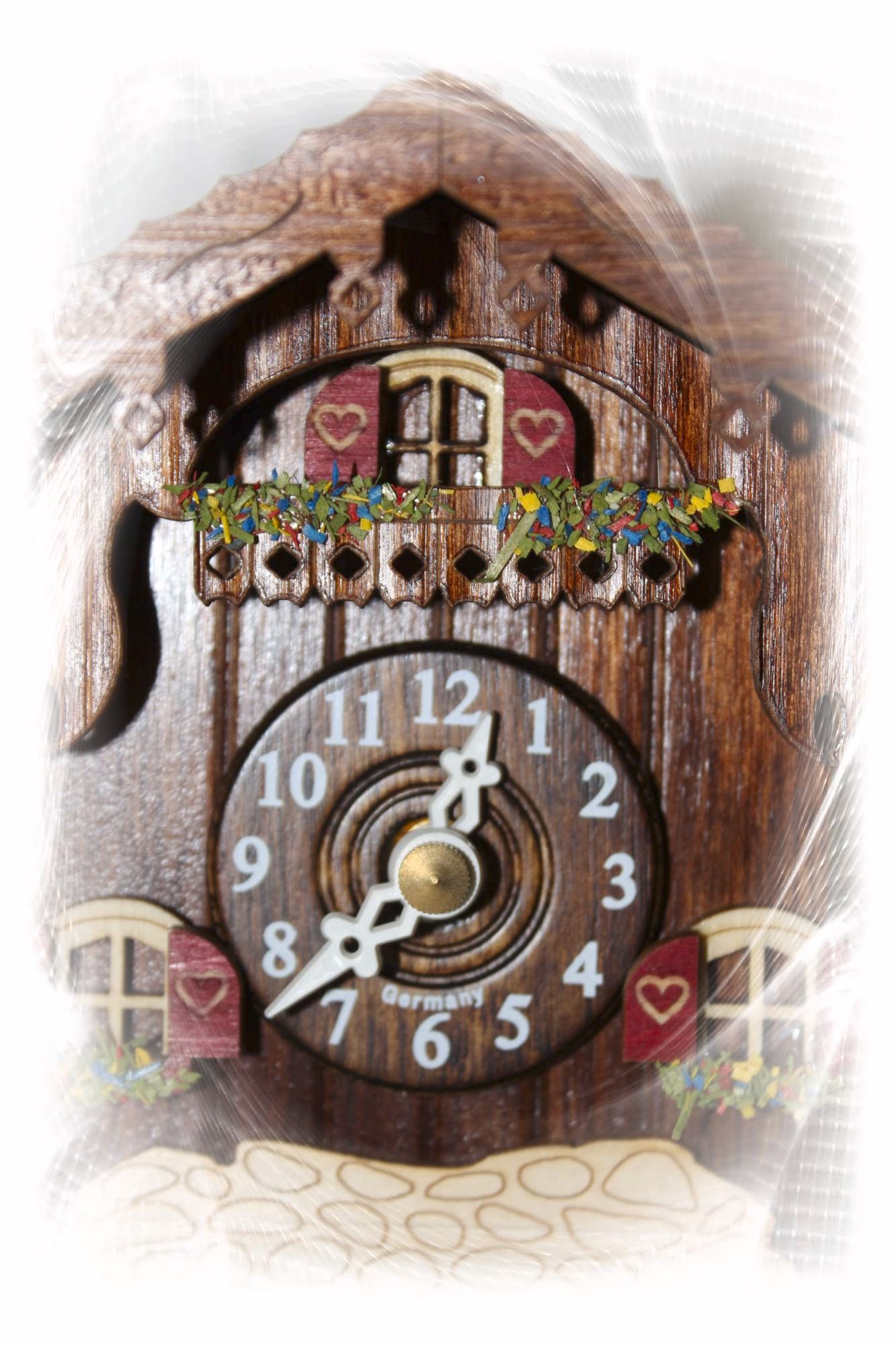 In dem Uhrenhäuschen ist ein Quarzwerk und zu jeder Stunde ertöhnt der Kuckuckruf.