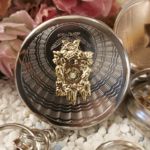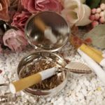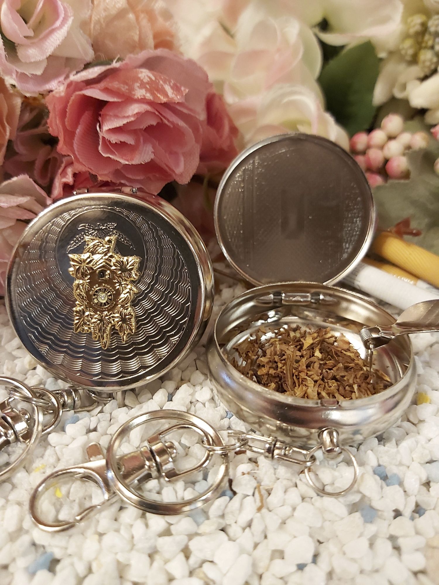 Hier bieten wir Ihnen einen tollen kleinen silberfarbigen Taschen-Aschenbecher an, mit graviertem Muster im Deckel.