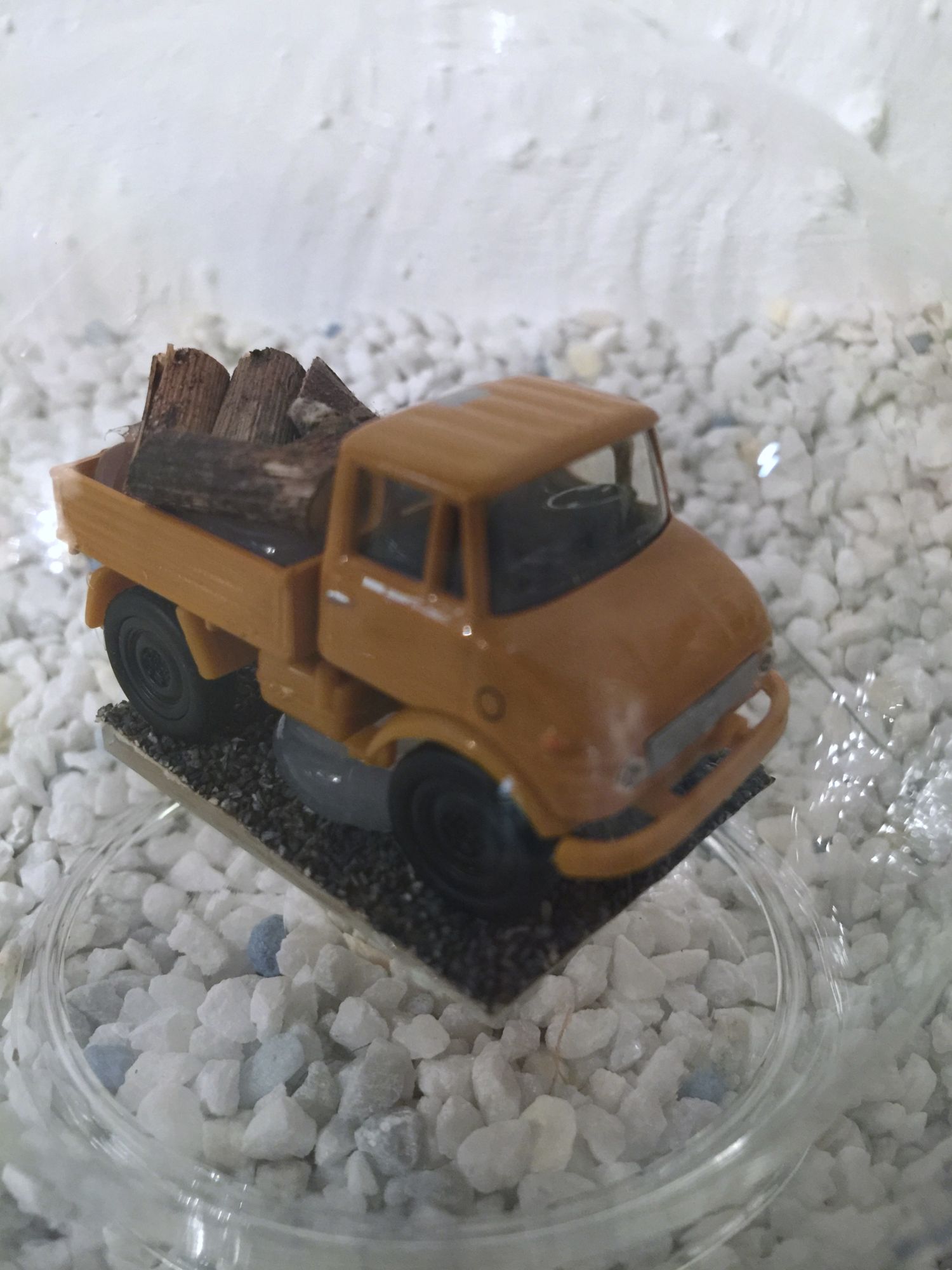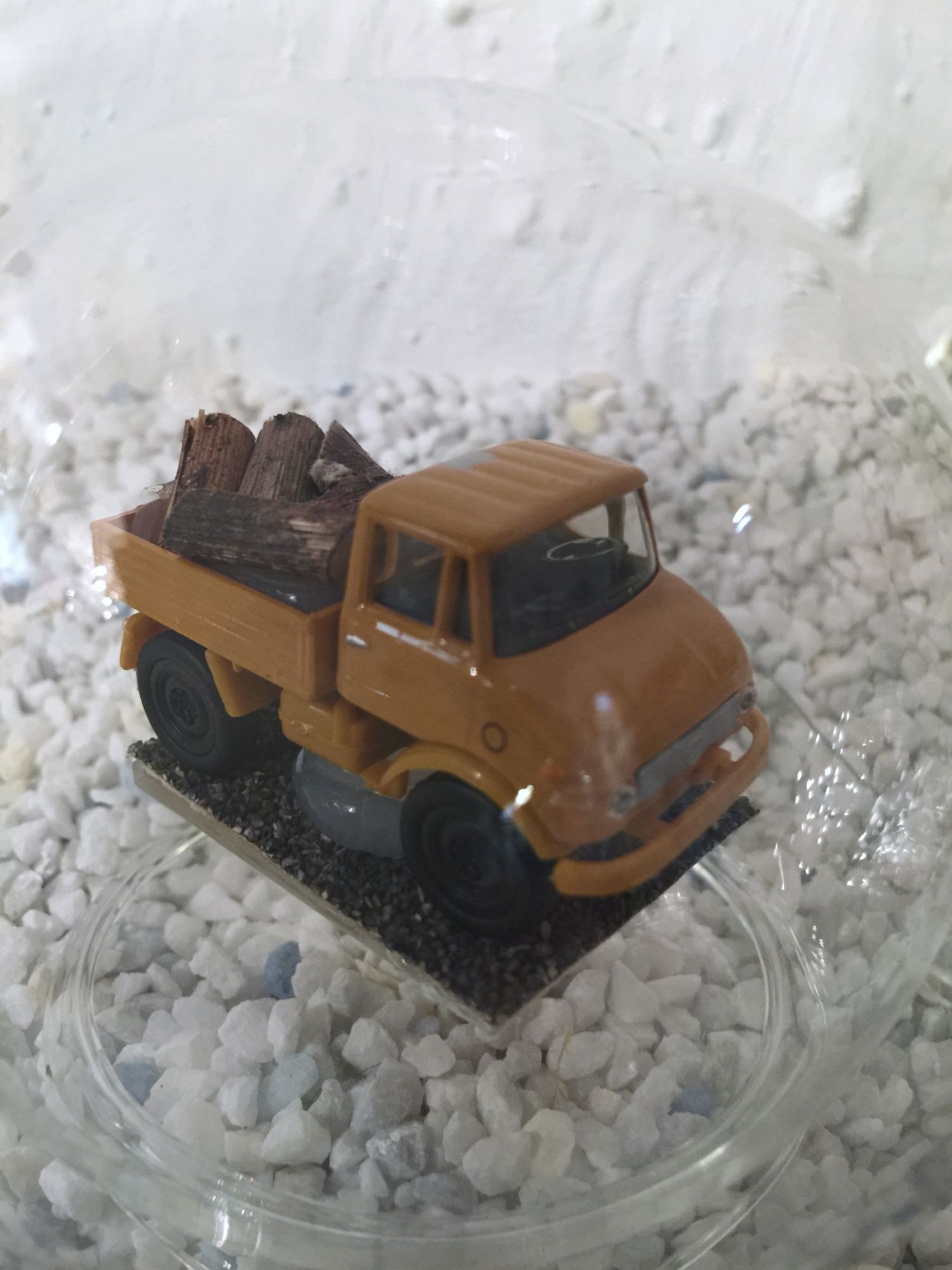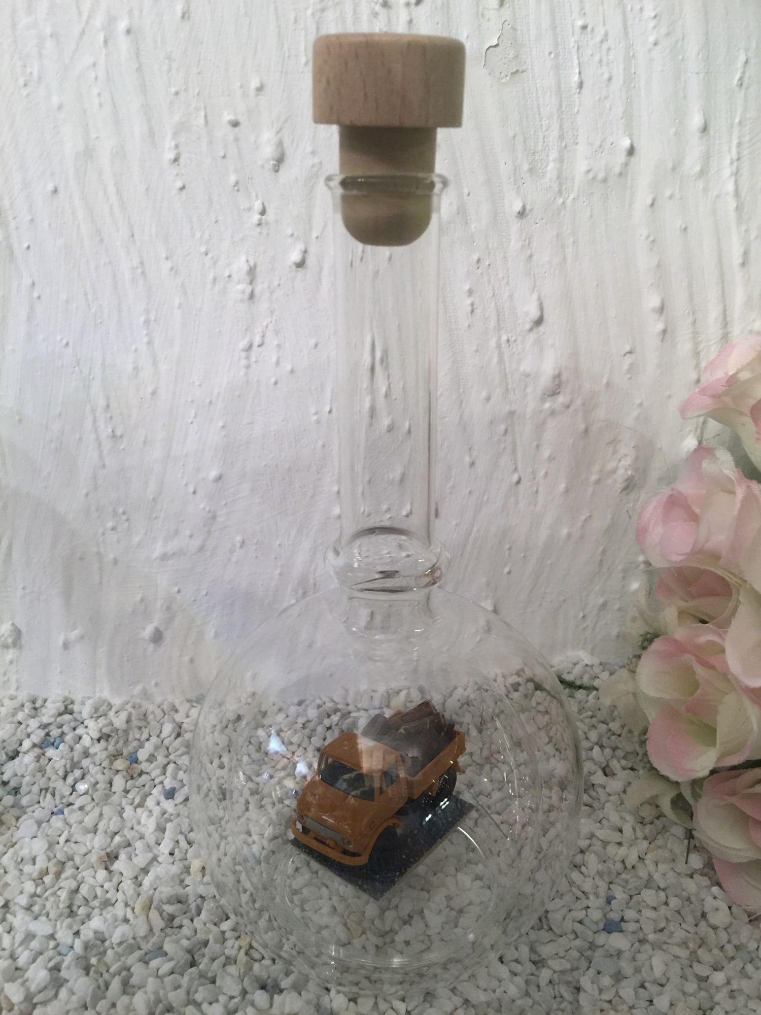 Hier zeigen wir Ihnen eine edle gefertigte, mundgeblasene Glasflasche mit einem Fahrzeug-Modell 1:87 des legendären Unimogs MB 406