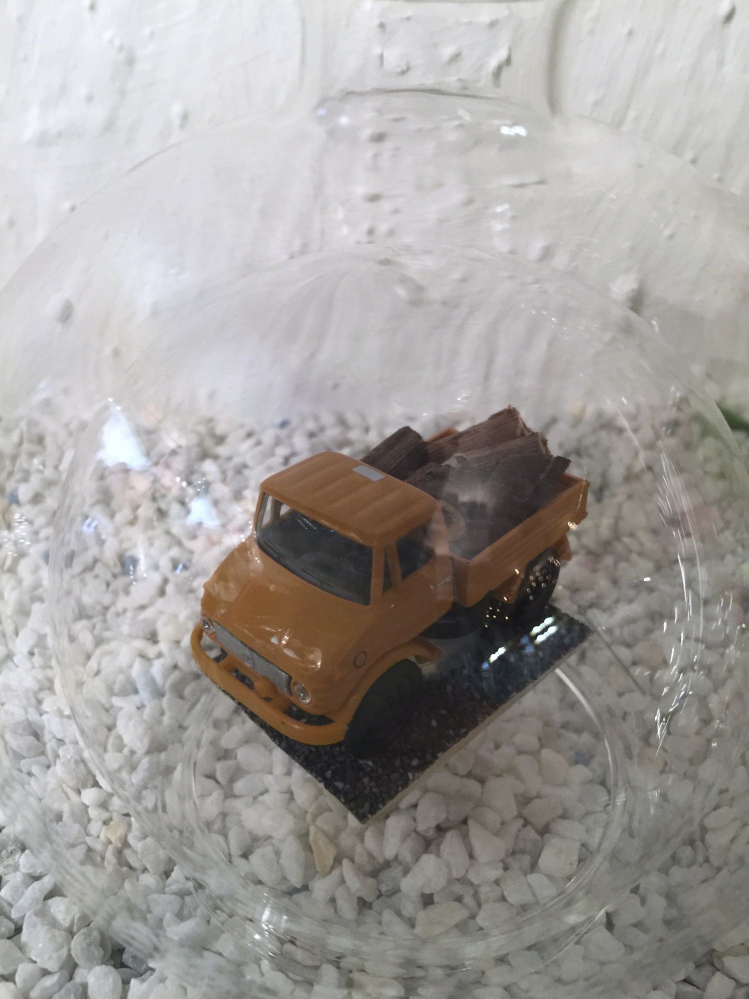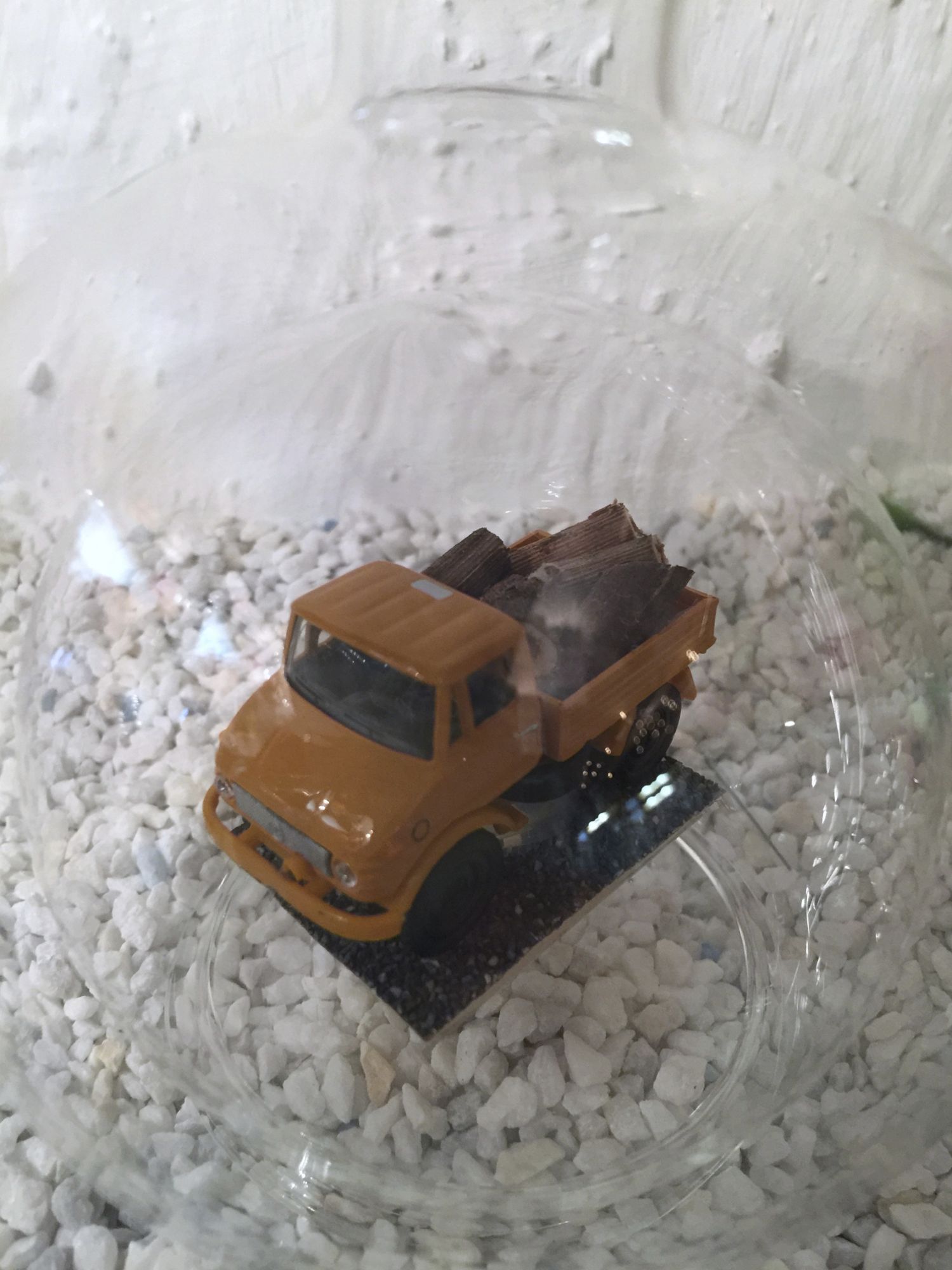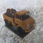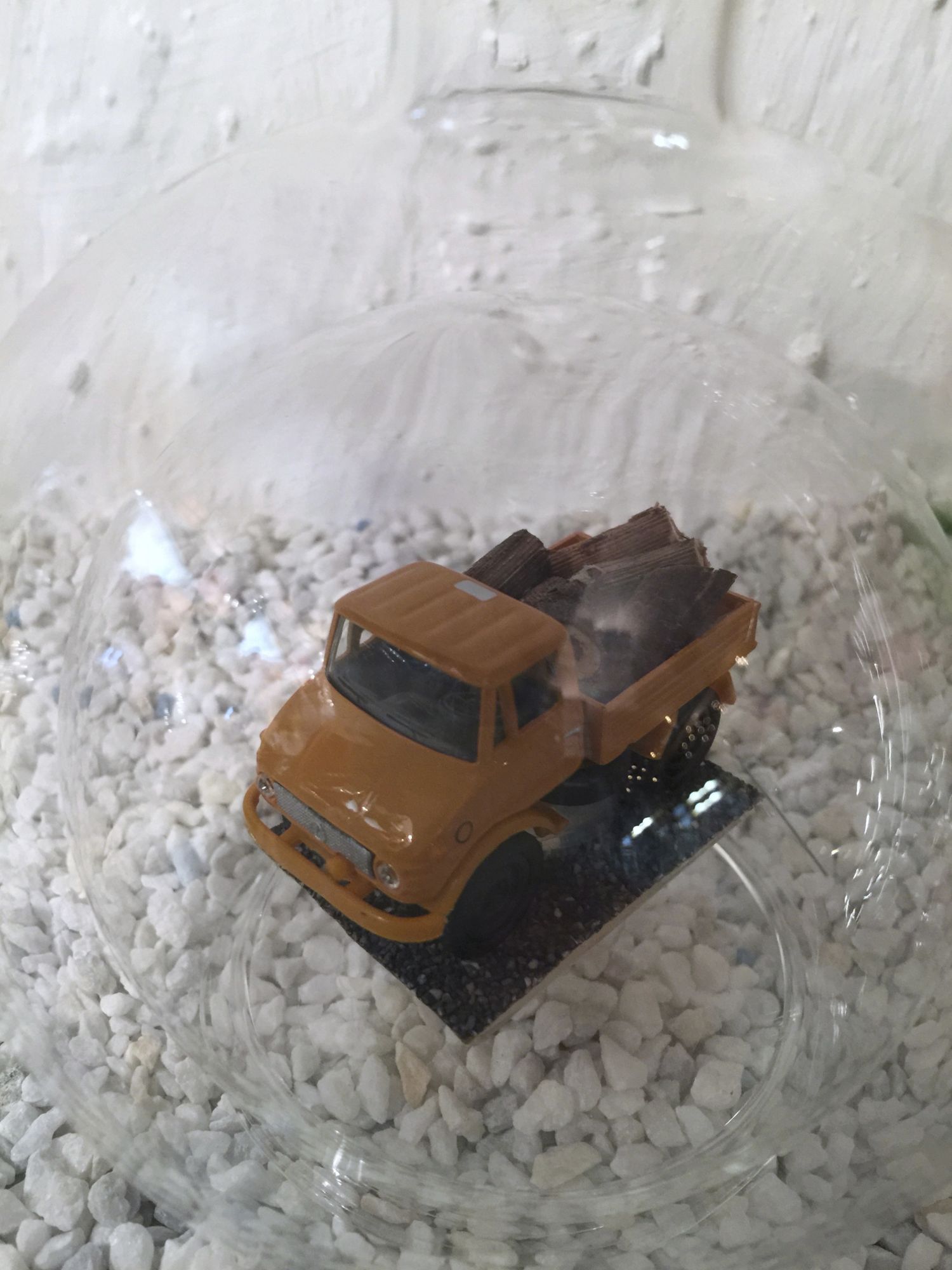 Hier zeigen wir Ihnen eine edle gefertigte, mundgeblasene Glasflasche mit einem Fahrzeug-Modell 1:87 des legendären Unimogs MB 406