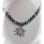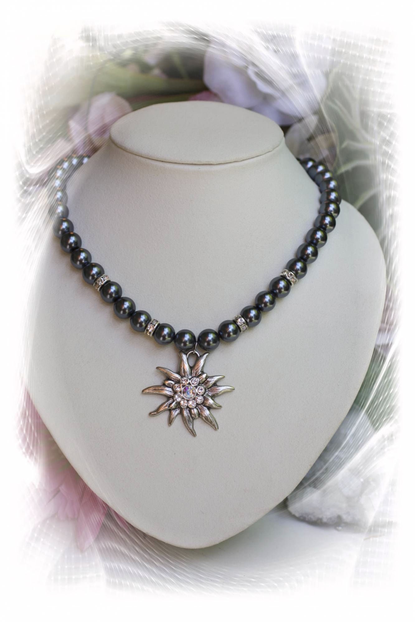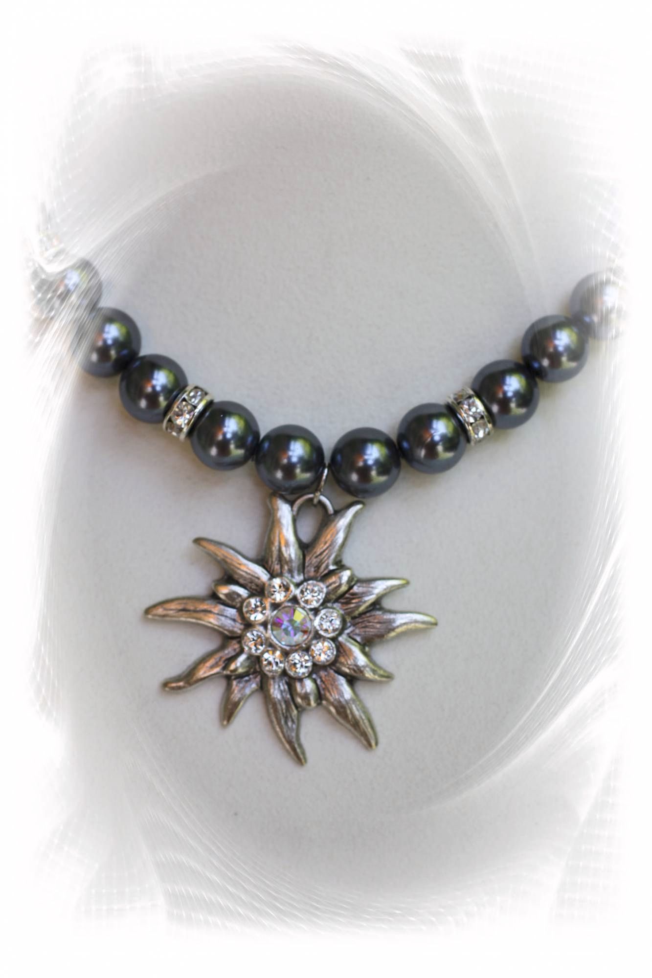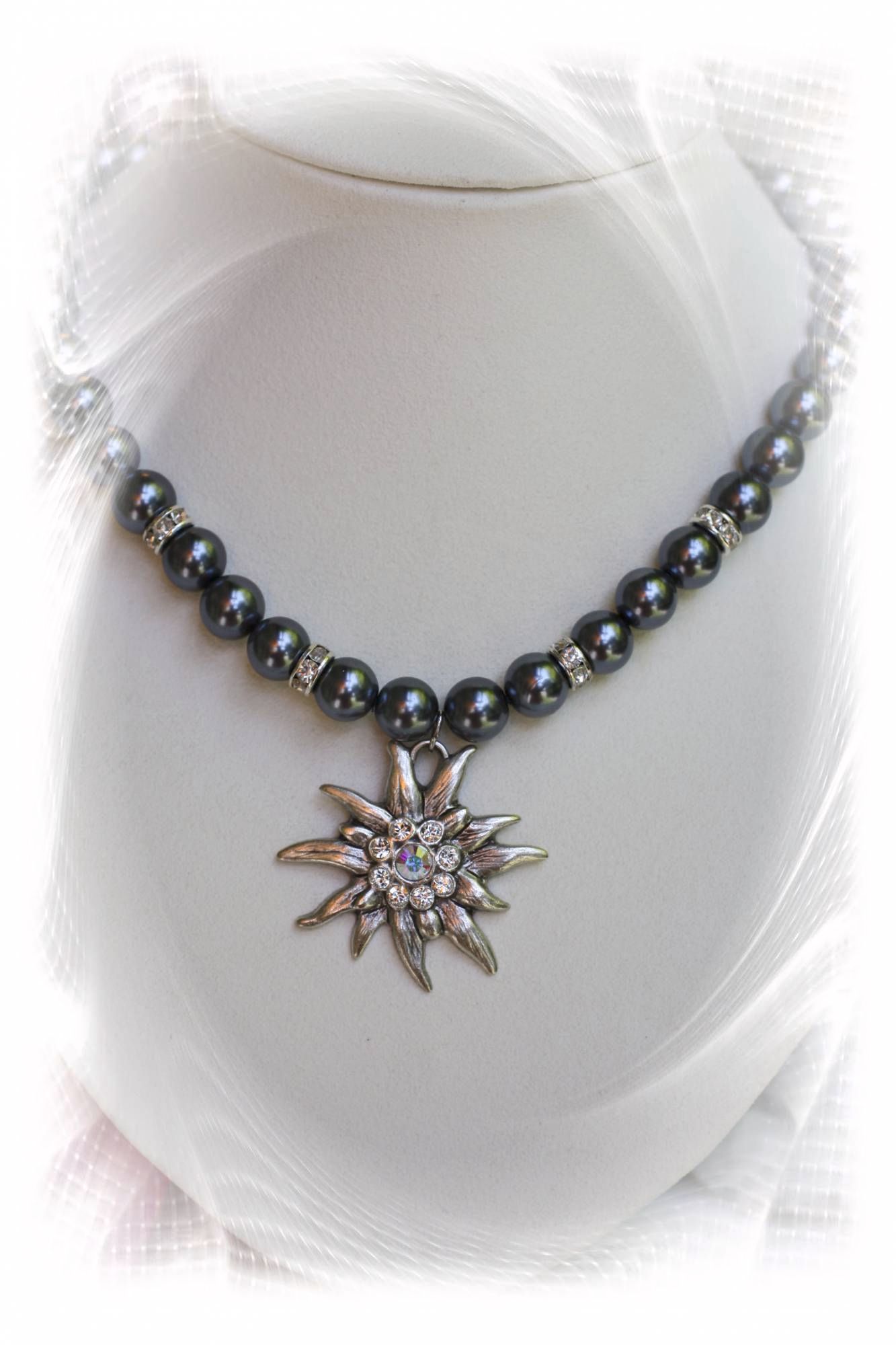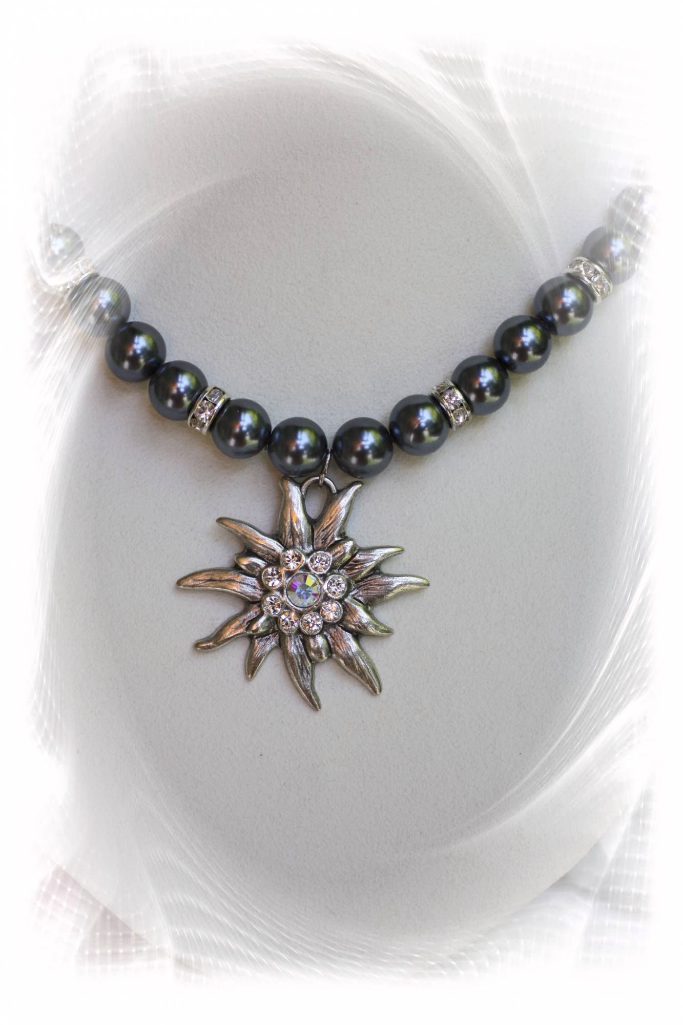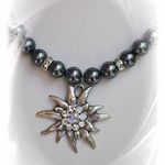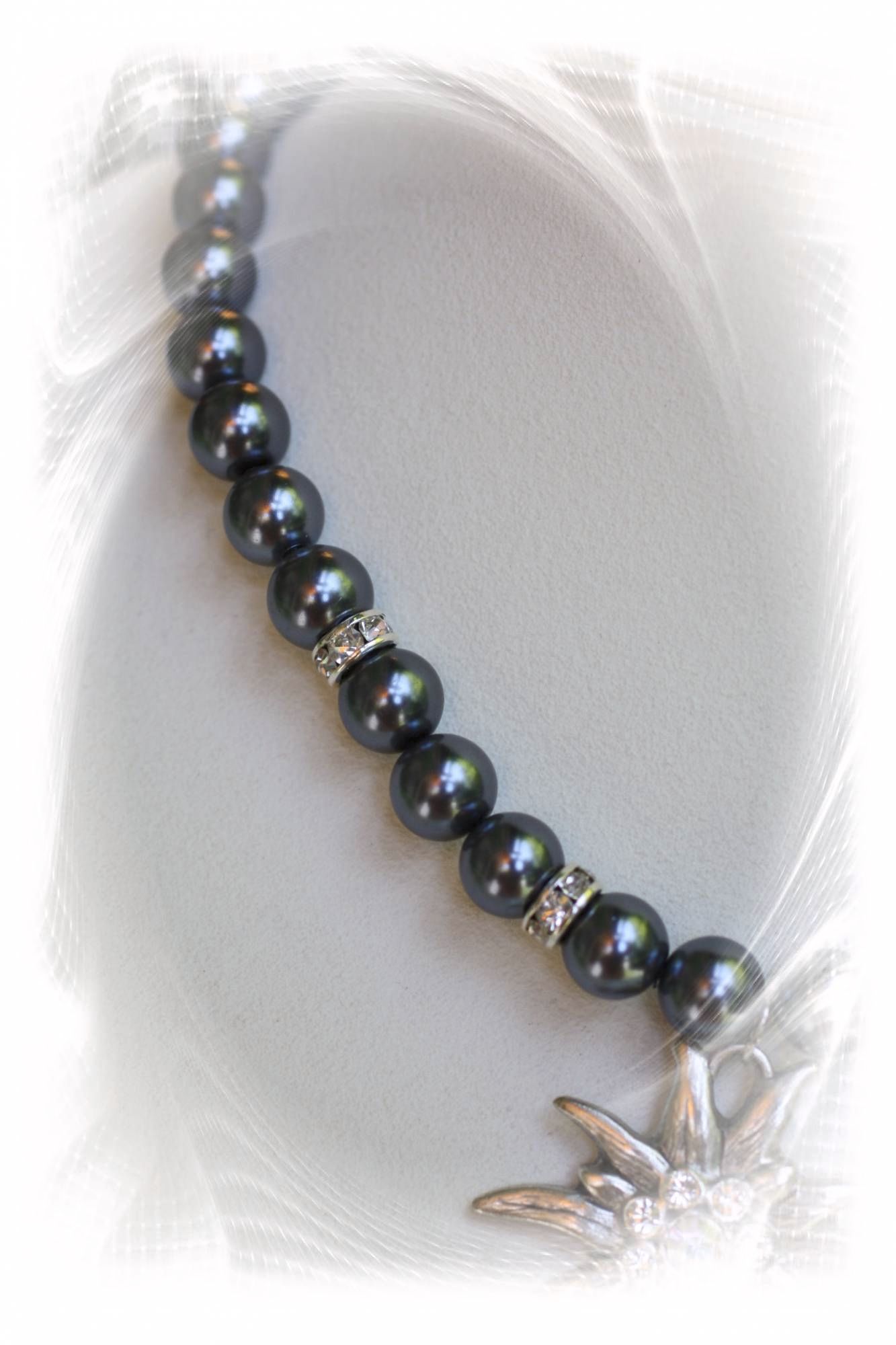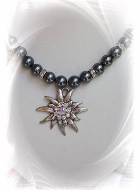 Sehr apart und fein gearbeitete Wachs-Perlenkette mit Edelweiß und farblich passenden Swarovskisteinen.