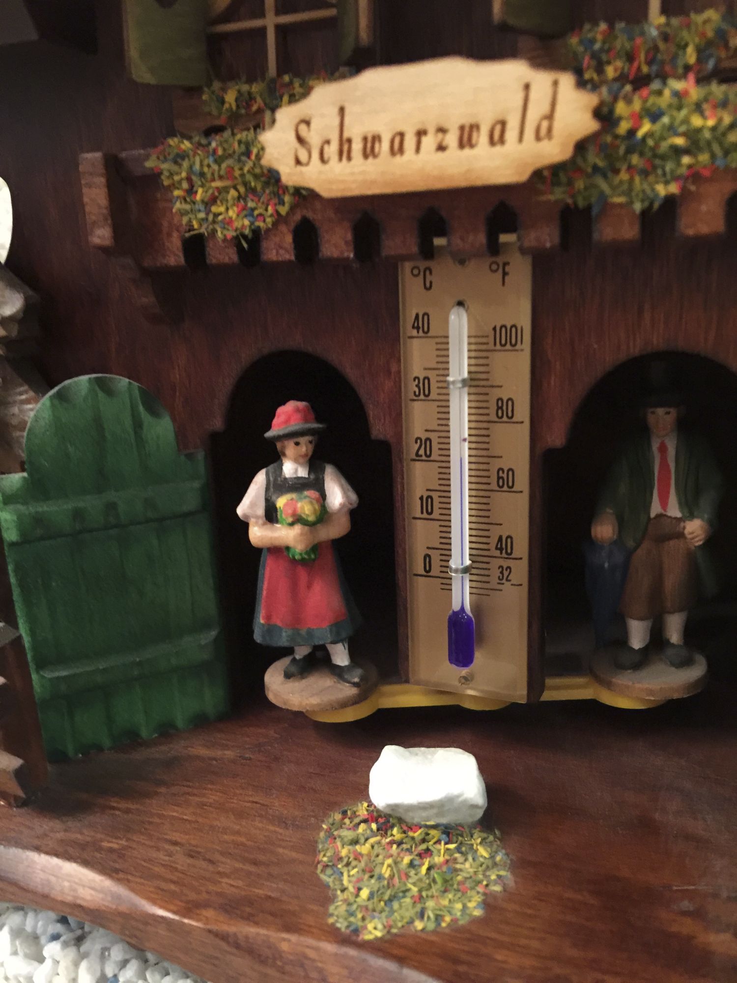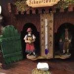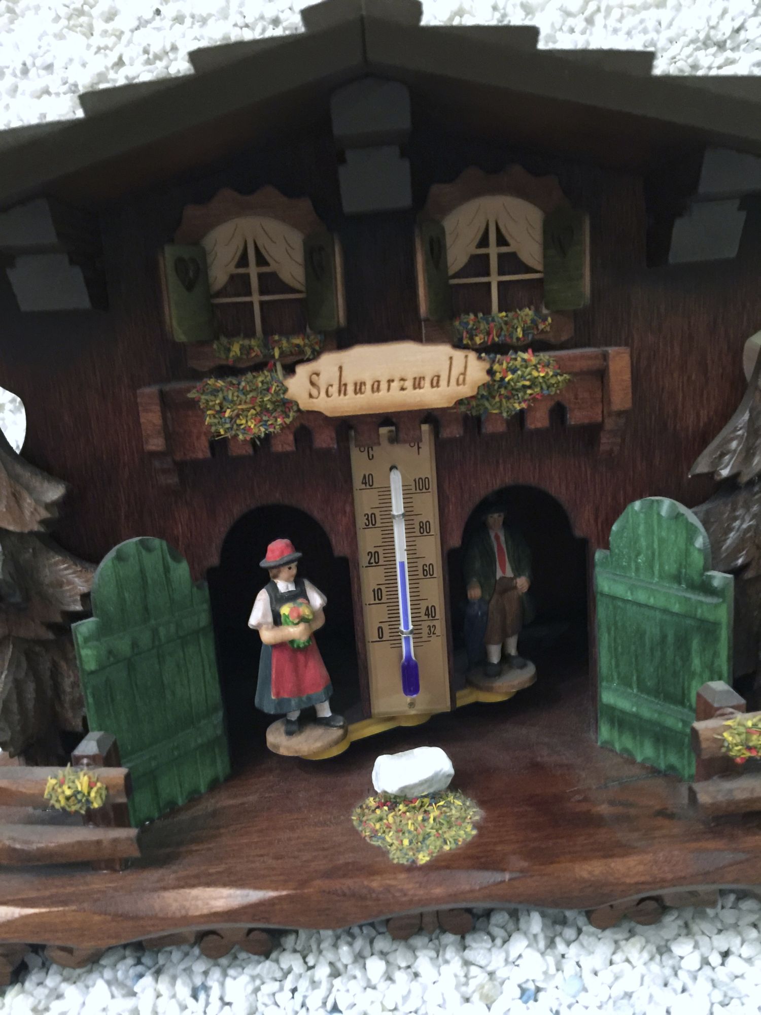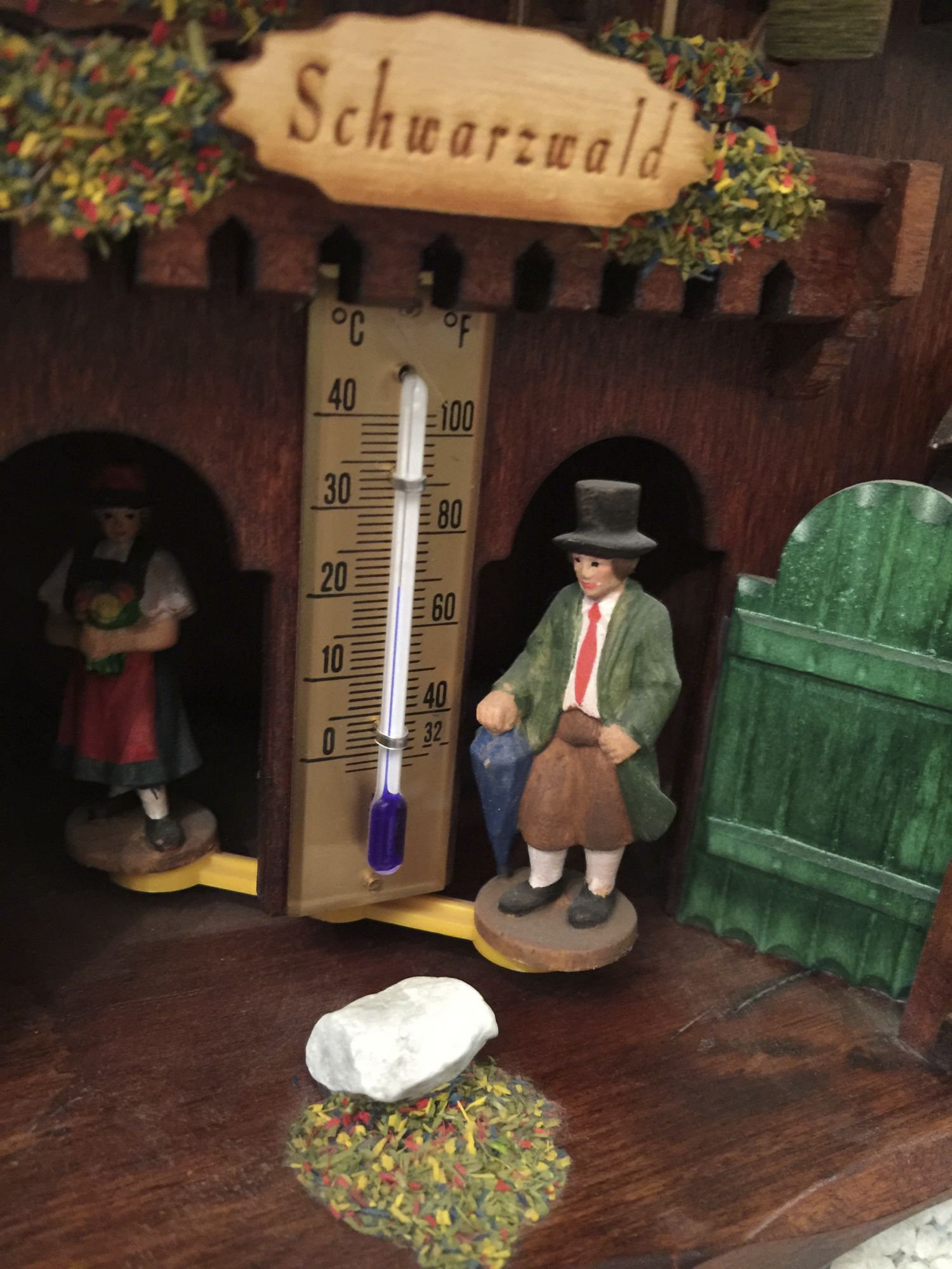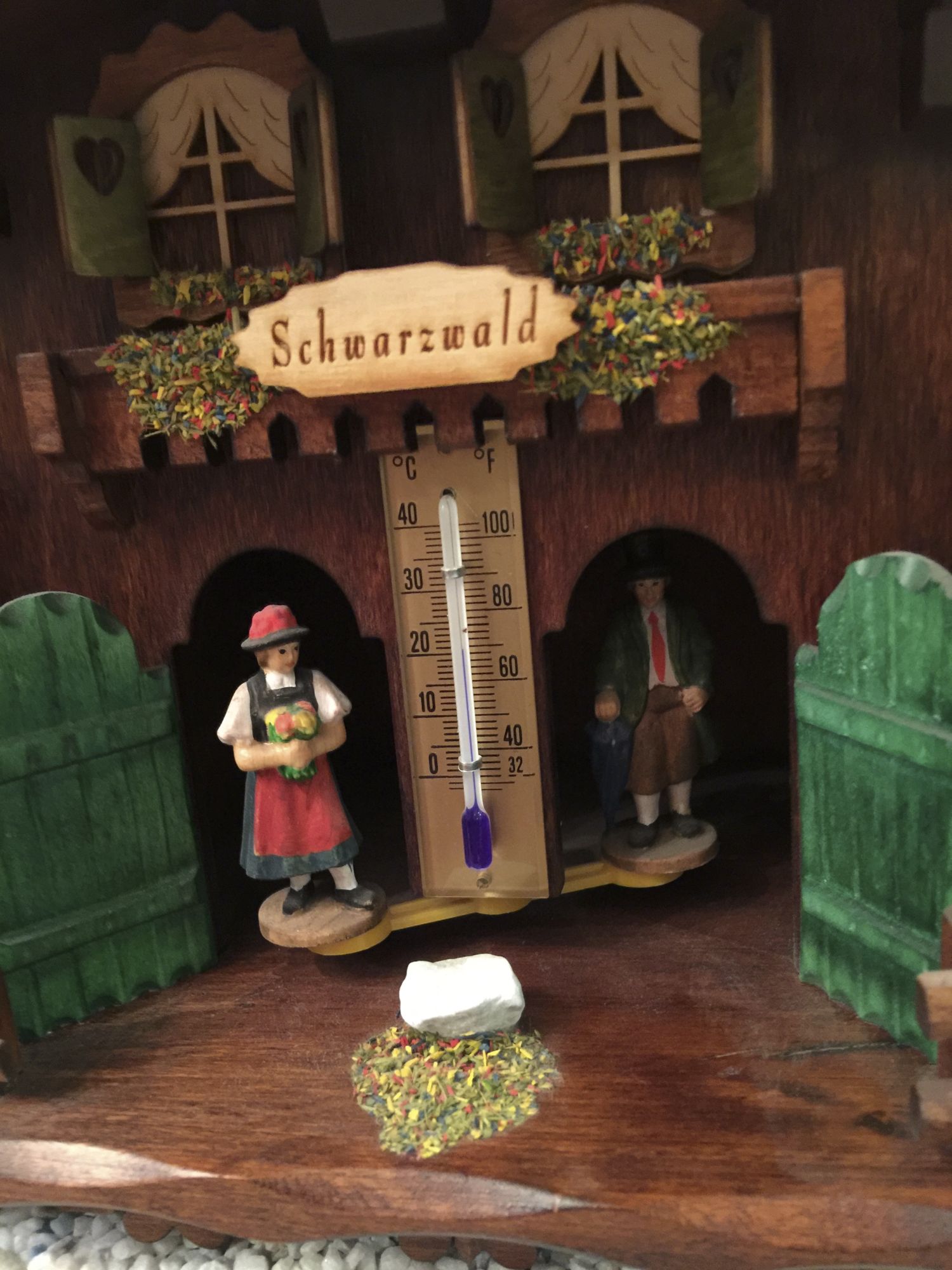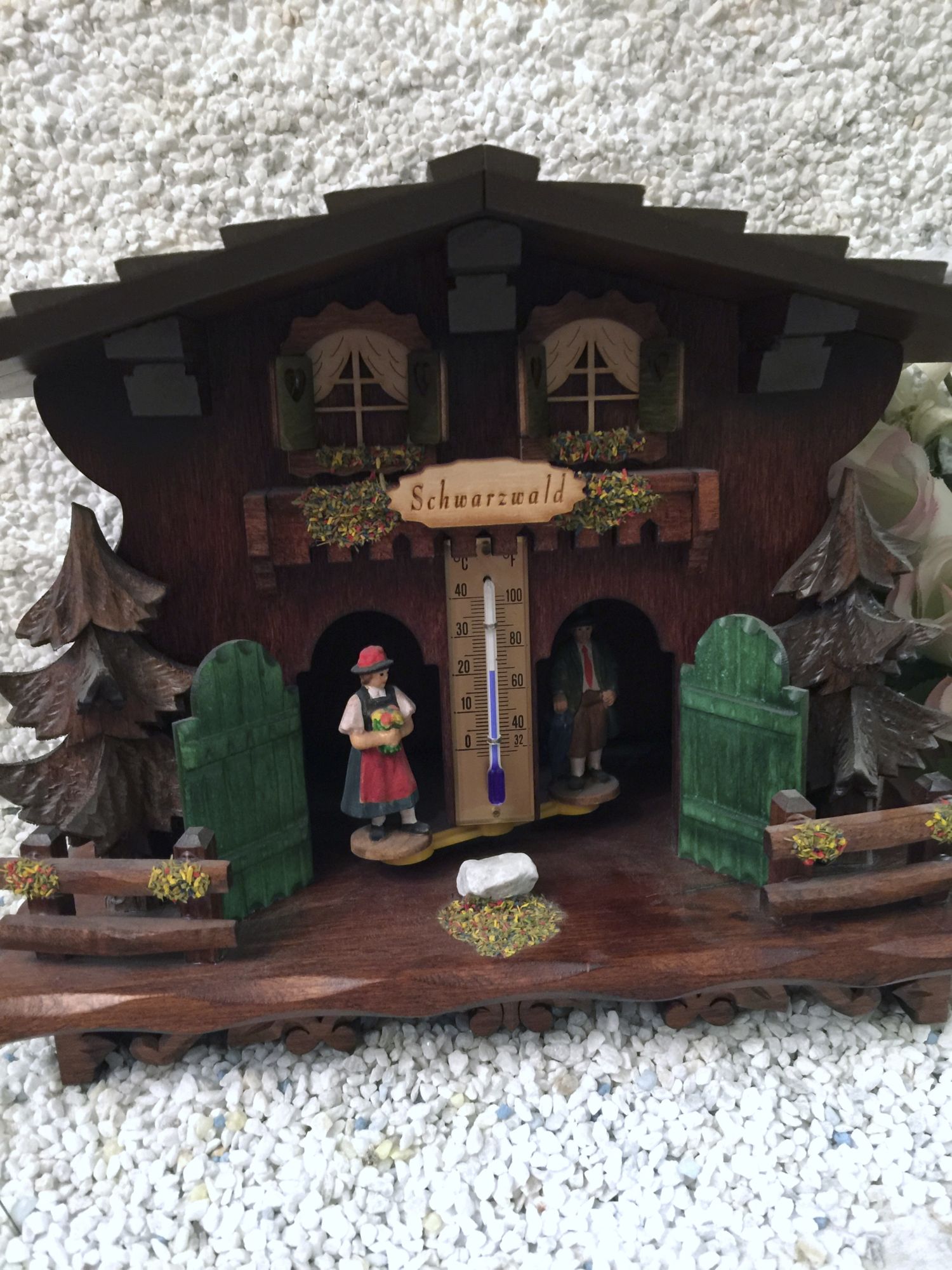Das Wetterhäusle ziert ein echtes Holzschild mit eingebrannter Aufschrift "Schwarzwald", einen Thermometer, sowie Figuren und Dedails, wie sie im Schwarzwald zu finden sind.