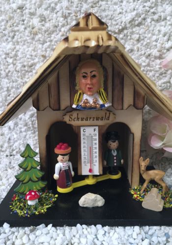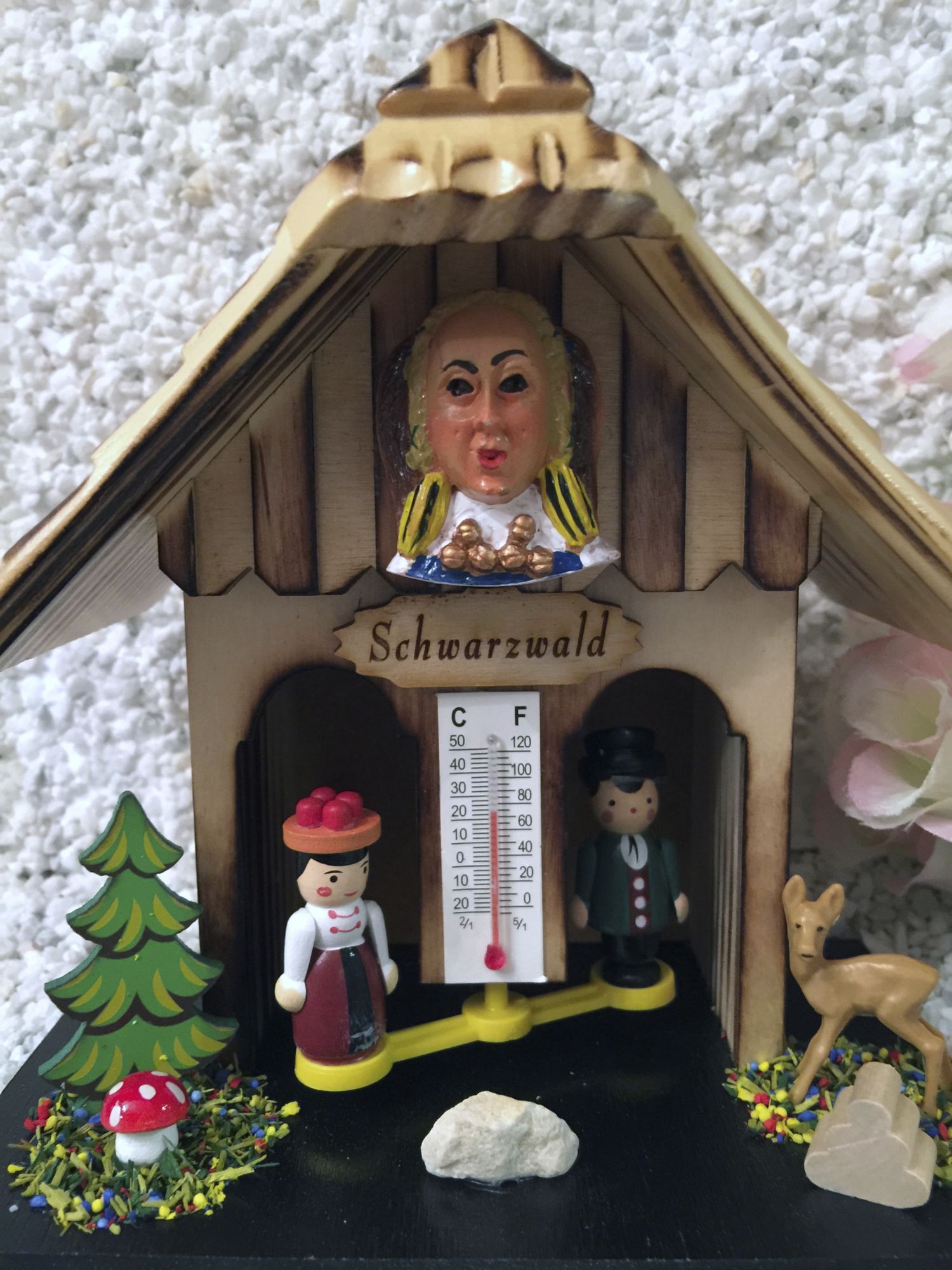 Das Wetterhäusle ziert ein echtes Holzschild mit der Aufschrift "Schwarzwald" und einem Thermometer.