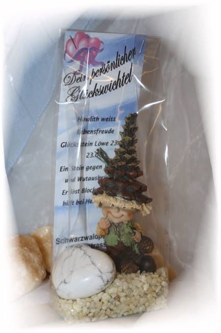 Die Wichtele werden als Geschenk in einer Cellotüte, mit Dekosteinchen als Geschenk verpackt geliefert.