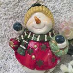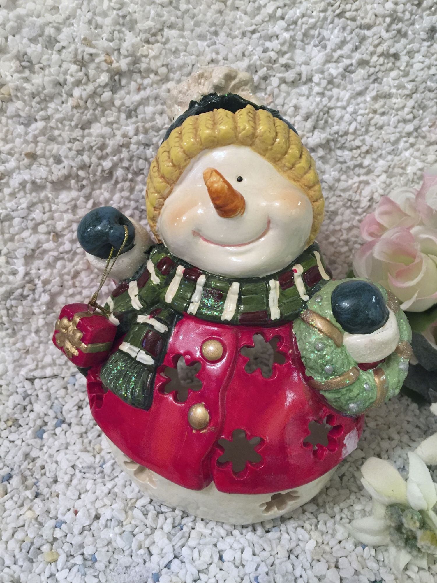 Schneemännle mit Winterpulli, Schal, Adventskranz und Geschenk