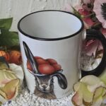 Diese Tasse außen weiss, innen weiss, schwarzer Rand mit schwarzem Henkel.