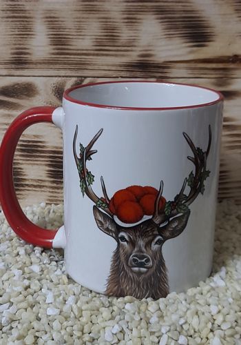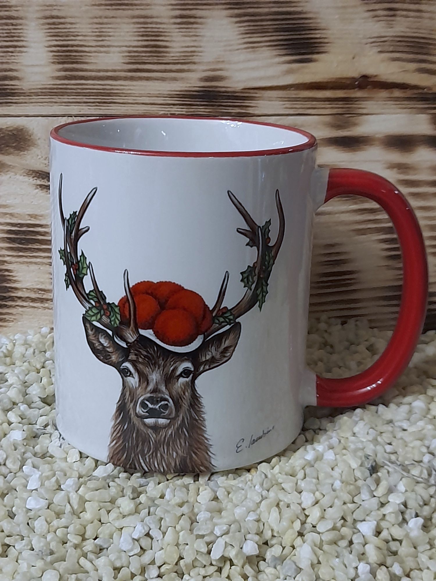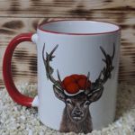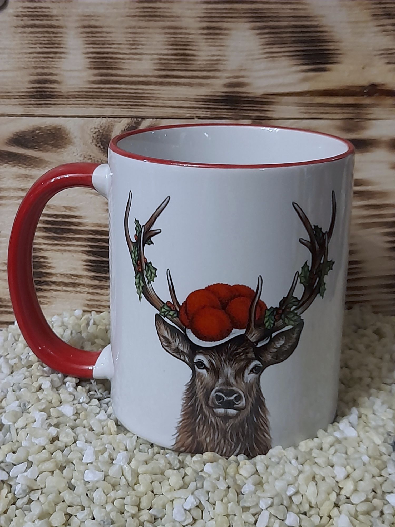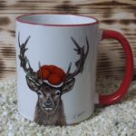 Diese Tasse außen weiss, innen weiss, roter Rand mit rotem Henkel.