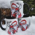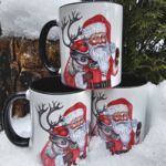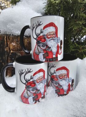 Eine traumhafte Tasse mit dem Weihnachtsmann und seinem Rentier.