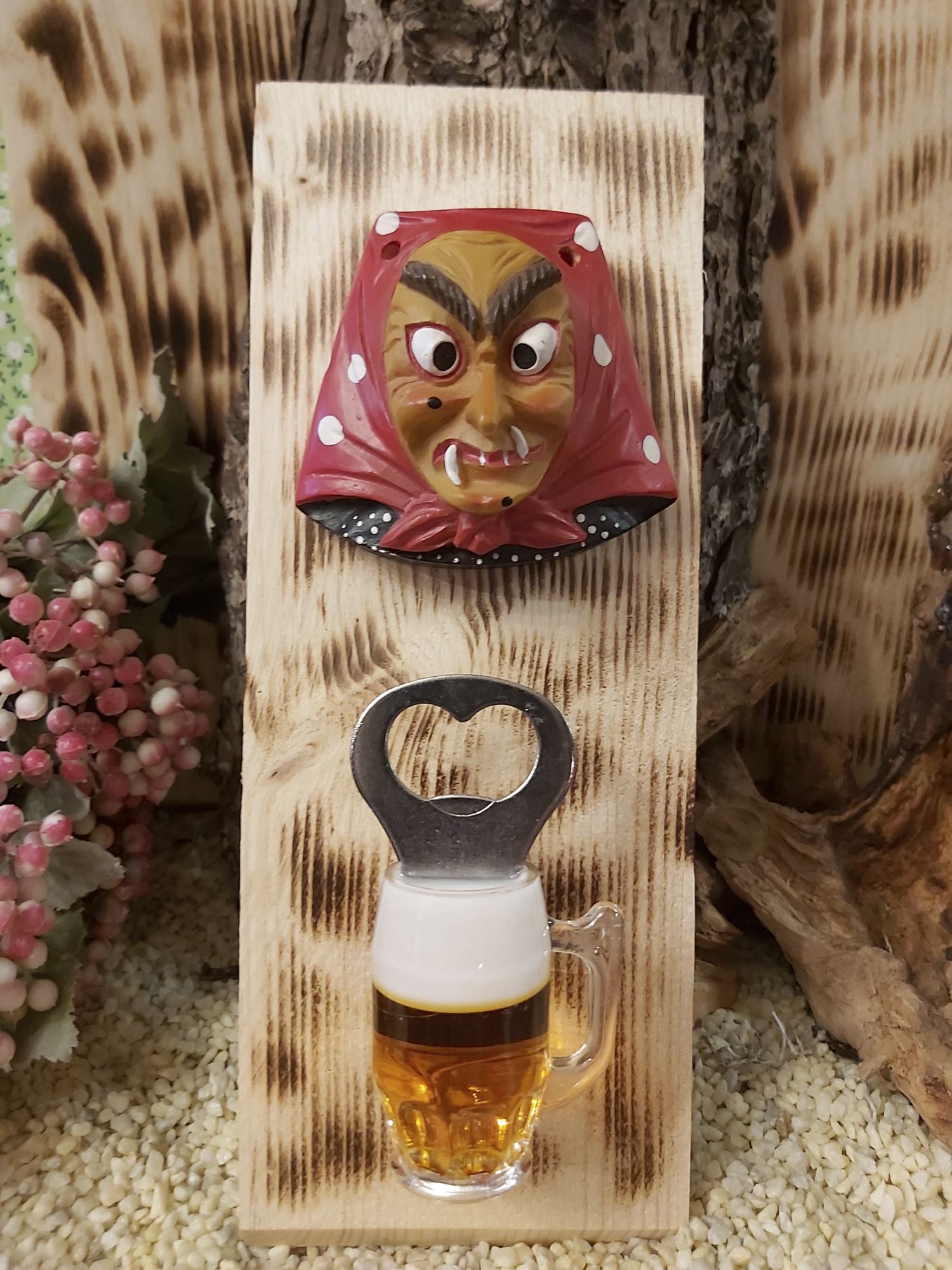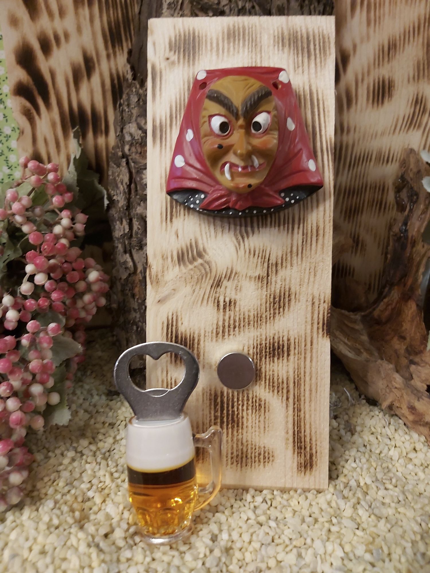 Sie sind aus Holz und von uns geflämmt mit einem Flaschenöffner als Magnet.