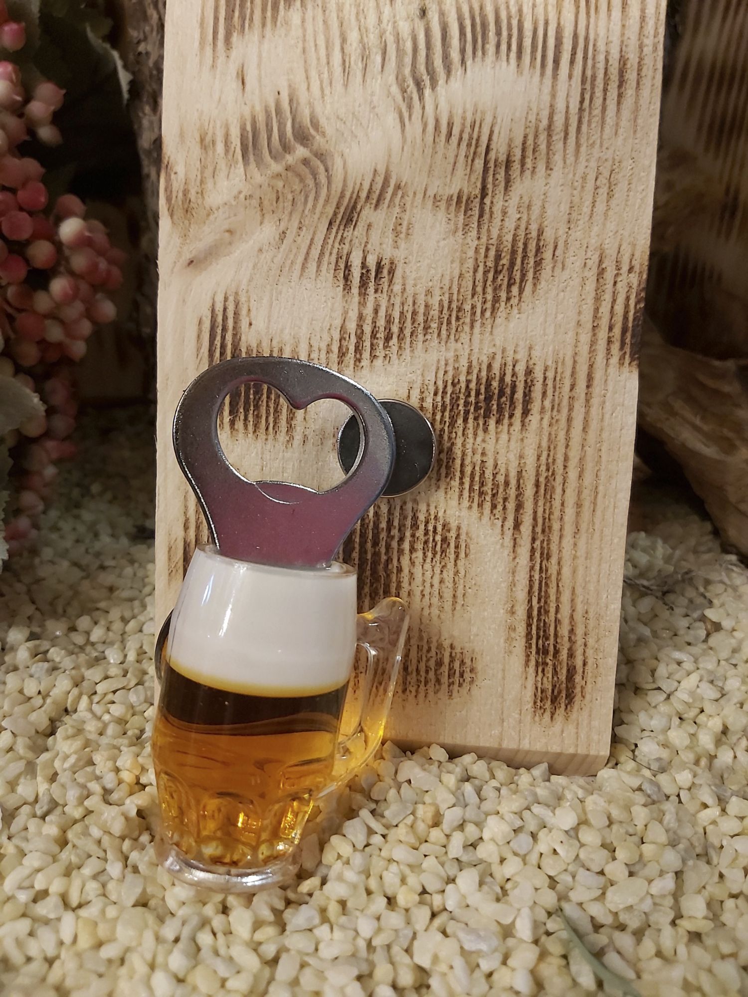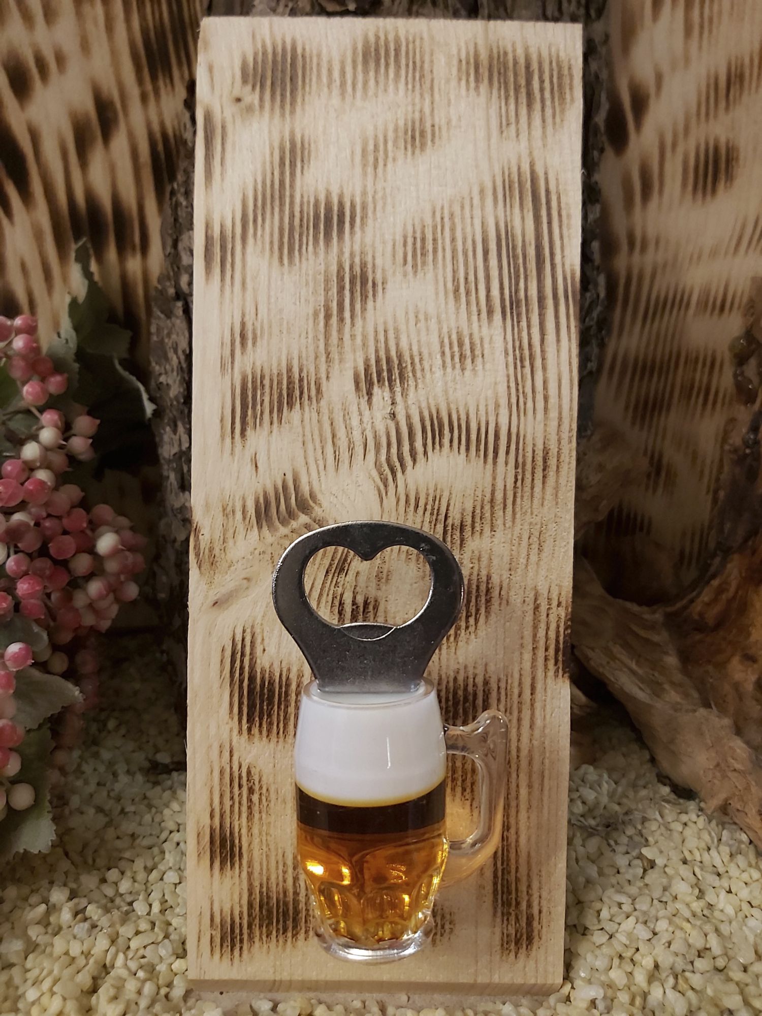 Sie sind aus Holz und von uns geflämmt mit einem Flaschenöffner als Magnet.