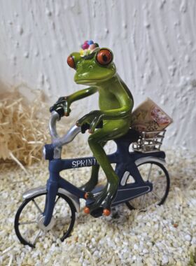 Glücksfrosch Fahrradfahrer mit blauem Fahrrad und großem Bollenhut