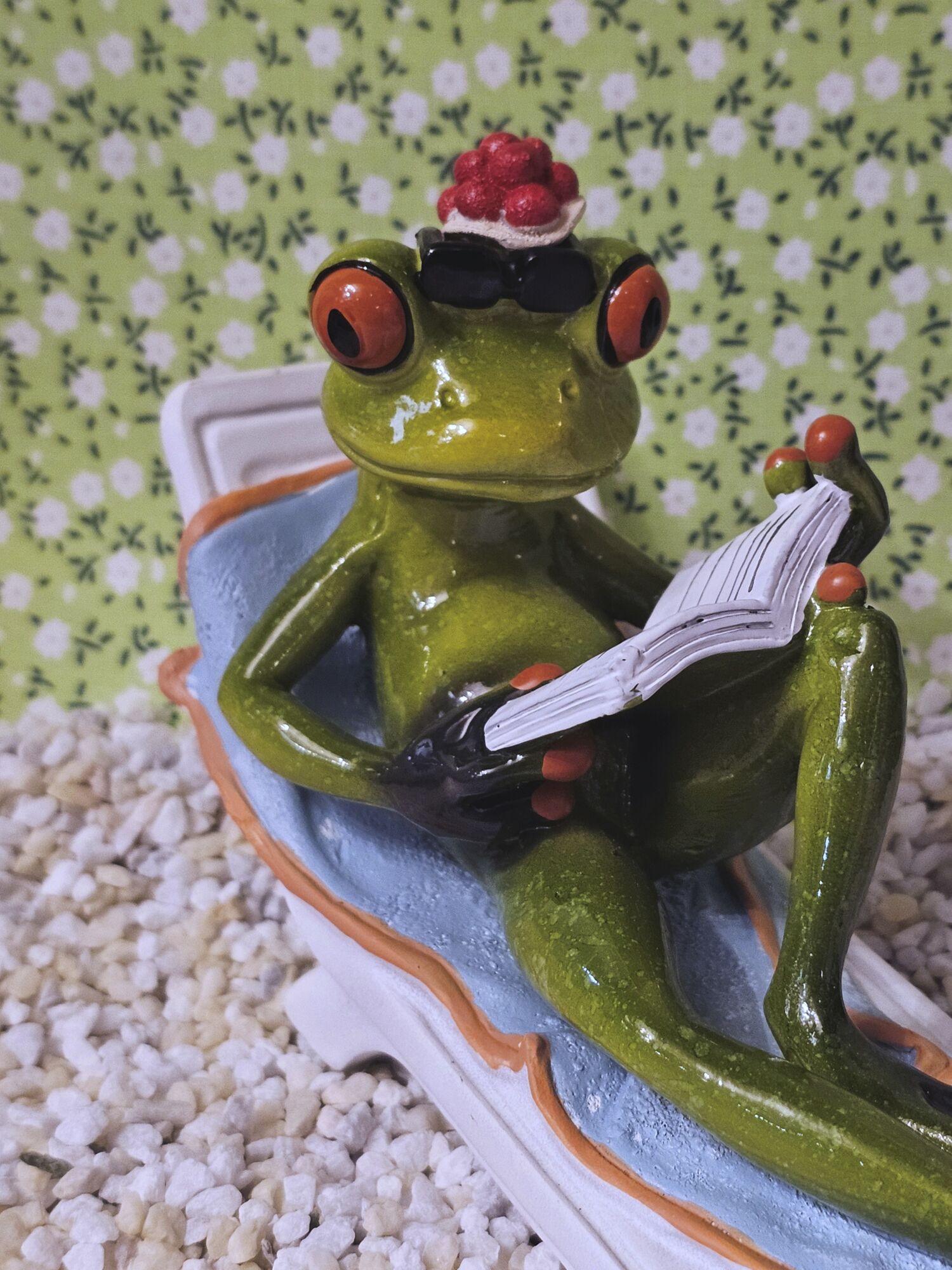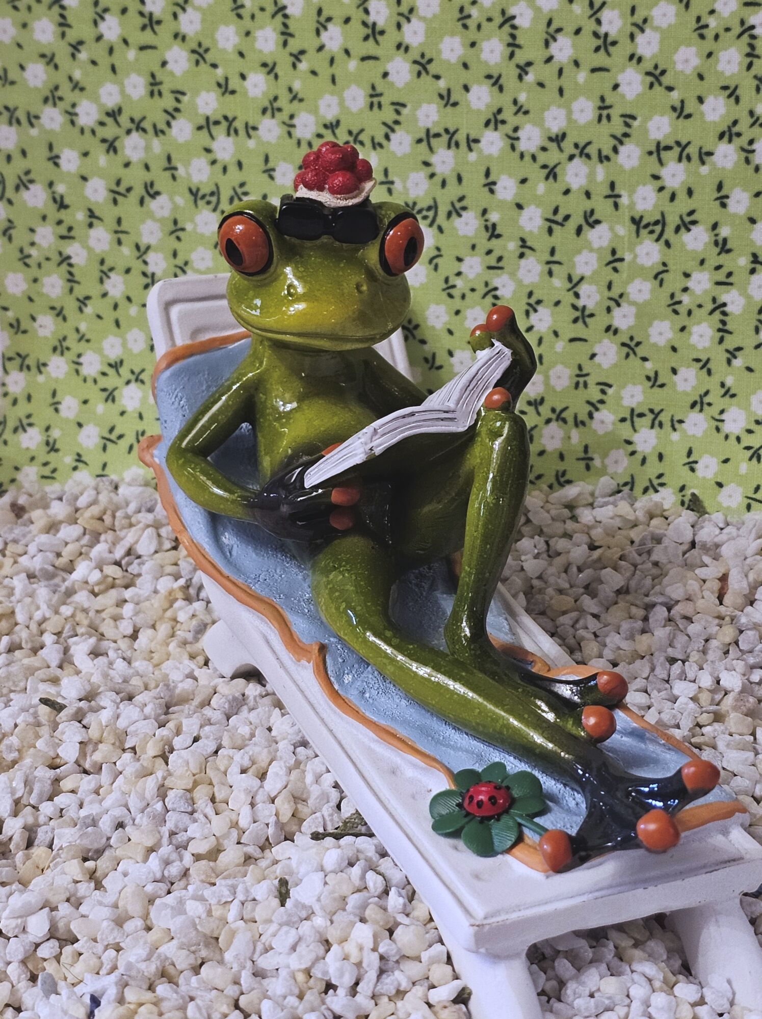 Urlaubsfröschle Thomas auf der Liege mit einem guten Buch