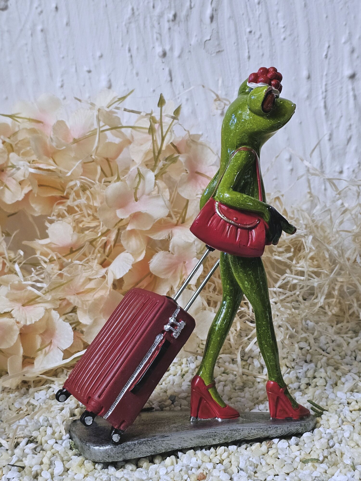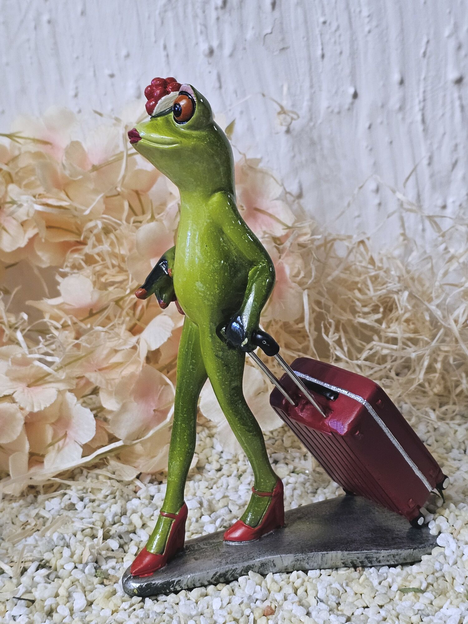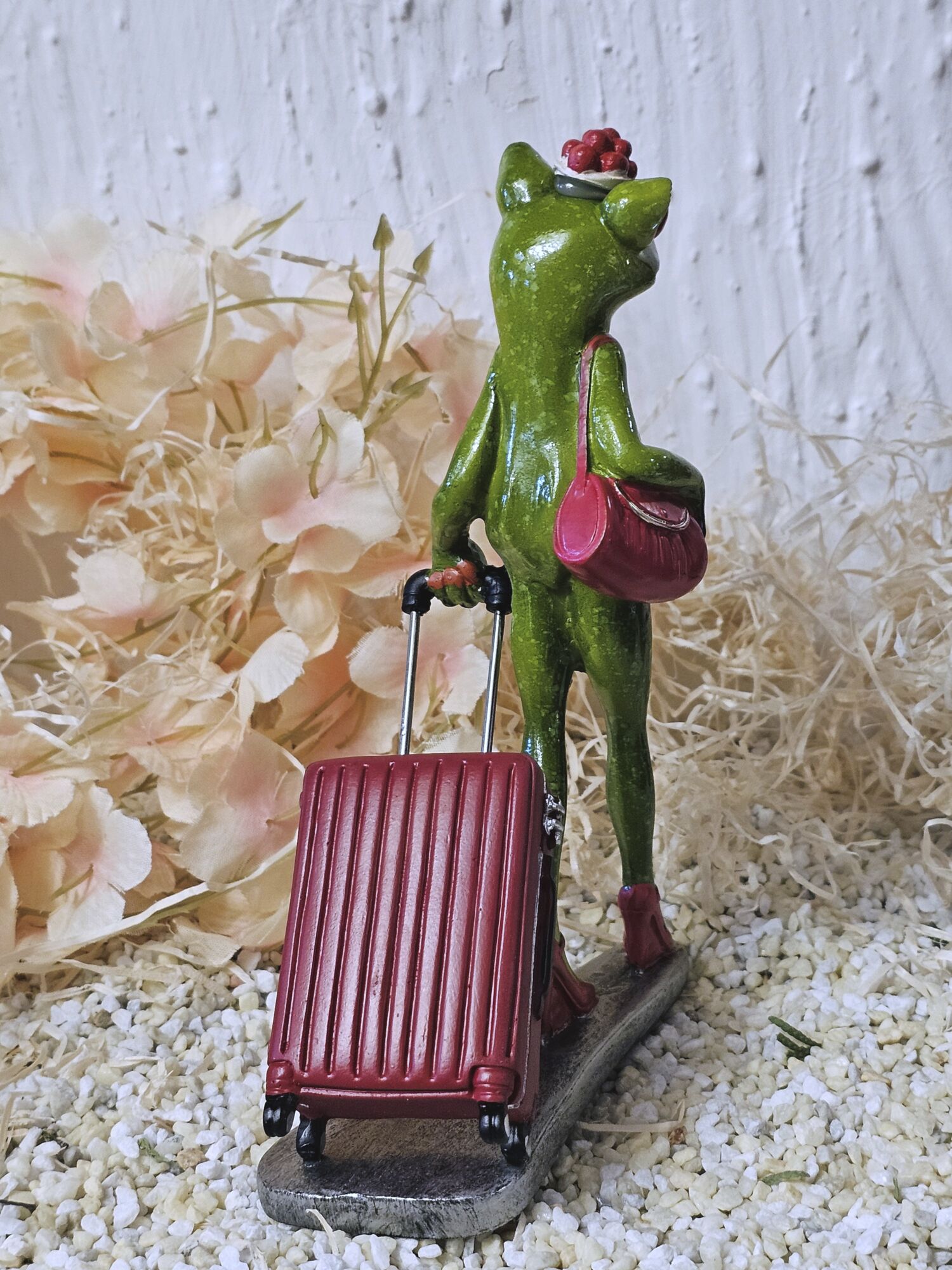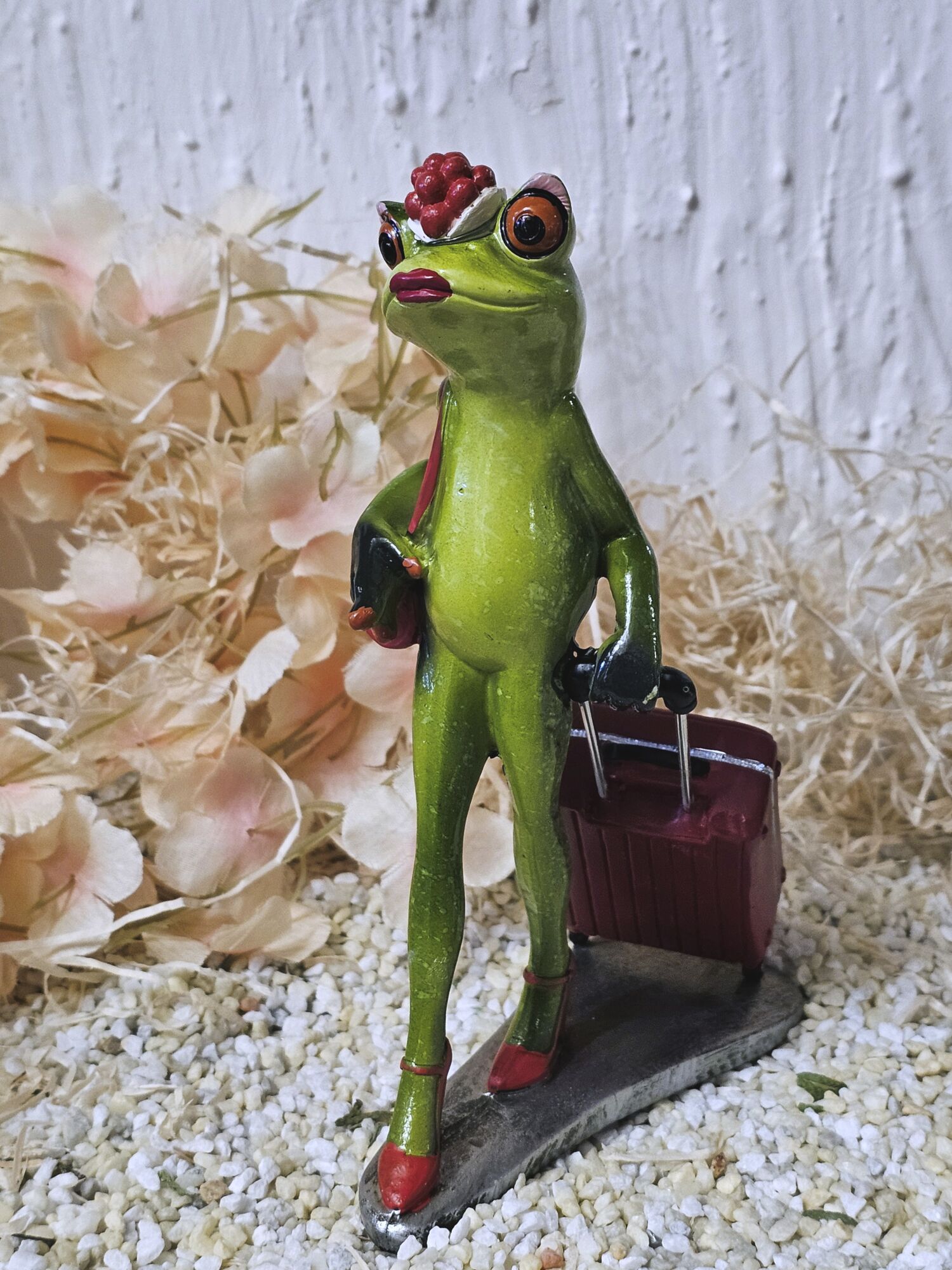 Urlaubsfröschle auf Reisen mit Koffer und Bollenhut