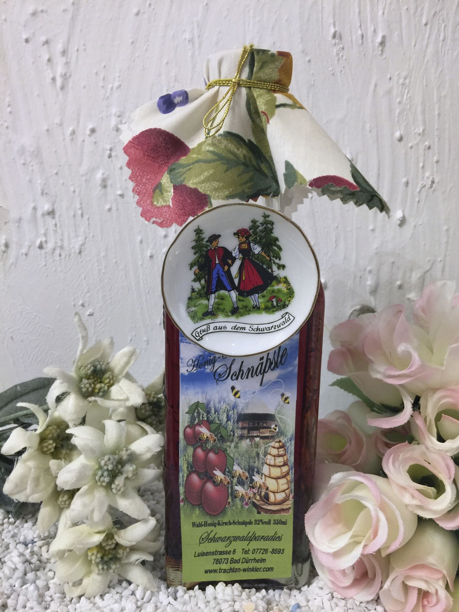 Abgefüllt in der schönen traditionellen Schwarzwaldflasche mit Schwarzwaldmotiven.