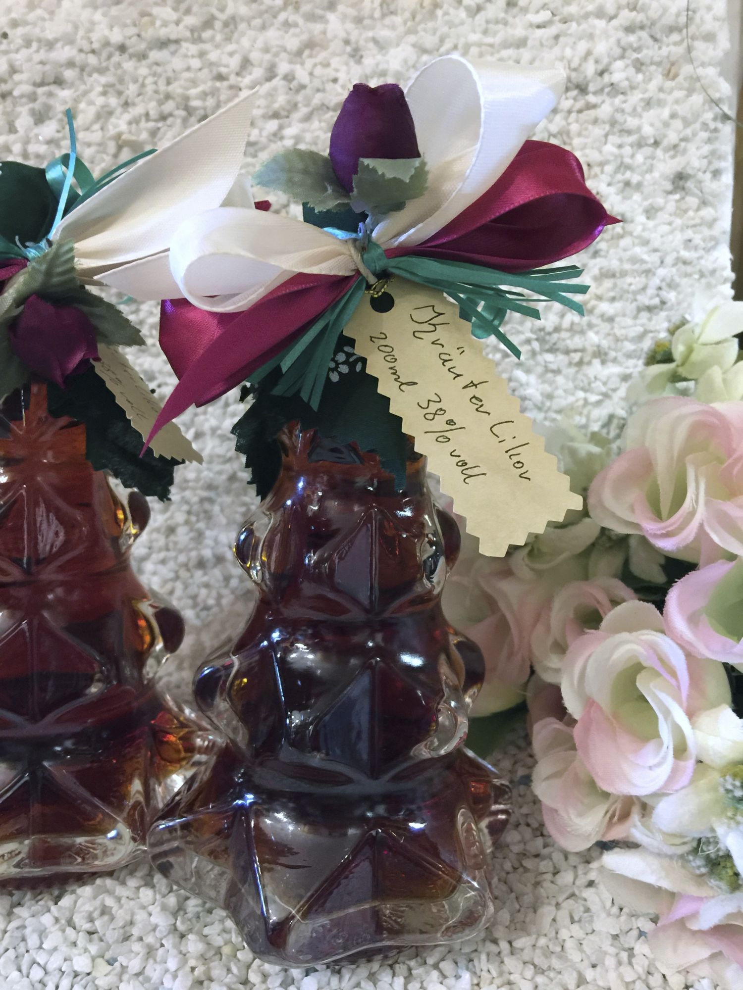 Jede Flasche wird bei Bestellung frisch abgefüllt und von uns mit Bändern und Schleifen veredelt.