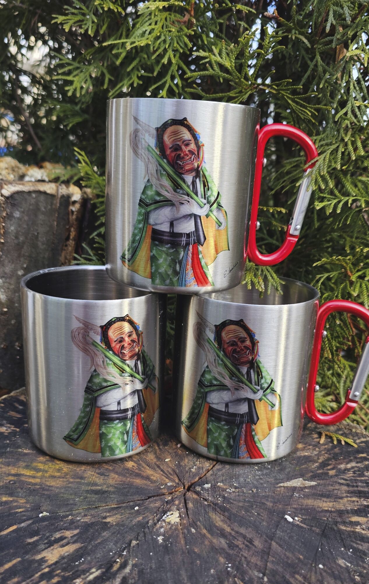 Hochwertige Edelstahltasse mit Karabiner und toller Farbbrillianz