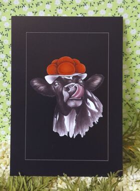 Postkarte Schwarzwald Kuh Fanny mit Zunge und Bollenhut